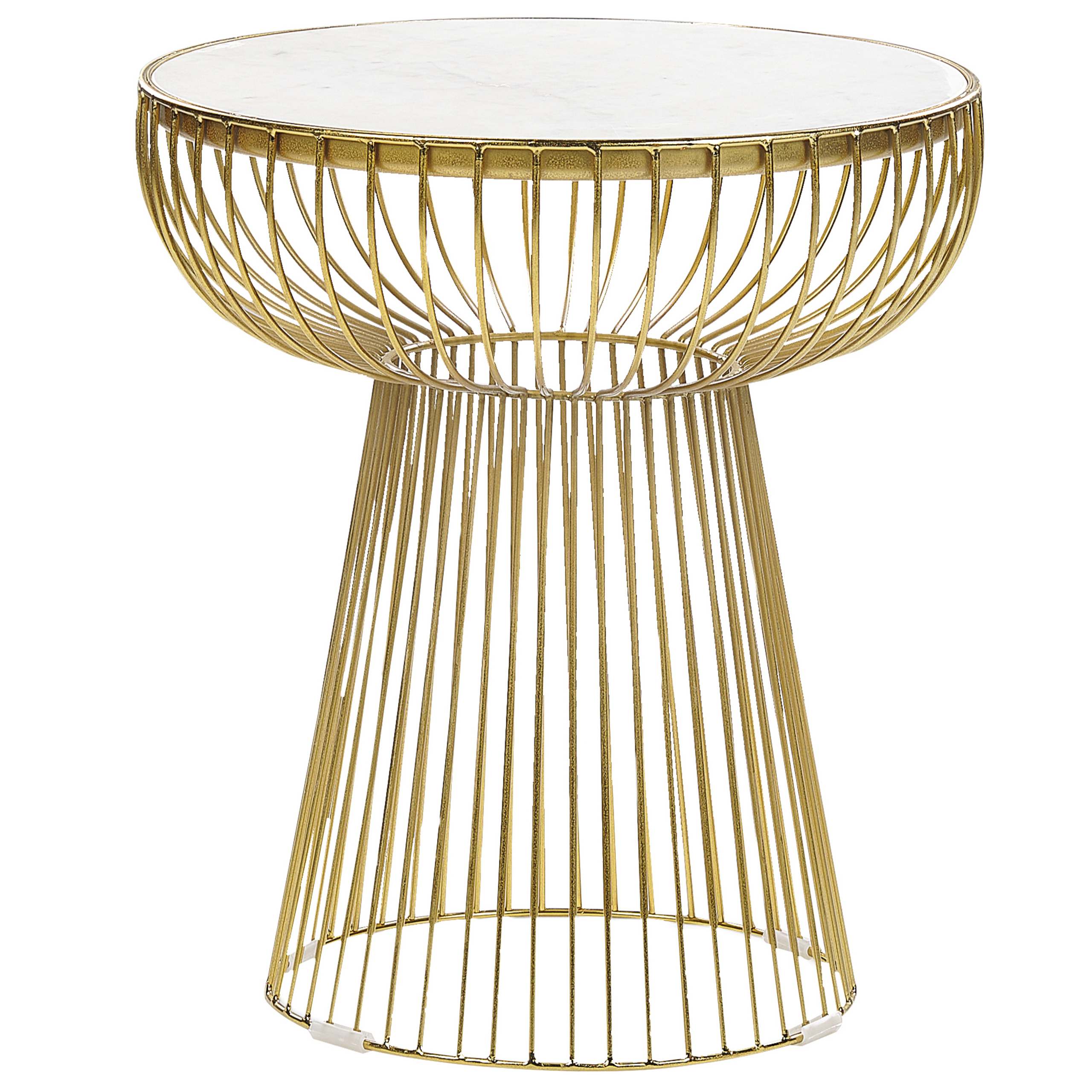 Glamour-tyylinen sivupöytä. Tyylikäs sivupöytä tuo hienostunutta ja ylellistä ilmettä mihin tahansa moderniin tai glamour-tyyliseen makuuhuoneeseen ja olohuoneeseen. Se tarjoaa loistavasti tilaa maljakoille, koriste-esineille tai vaikkapa pöytävalaisimelle. Pöytälevy on valmistettu valkoisesta marmorista ja avonainen, kiiltävä runko raudasta. Sivupöytä on erittäin vankka ja kestävä, eikä se vaadi päivittäistä ylläpitoa ilahduttaakseen ainutlaatuisella muotoilullaan vuosia.