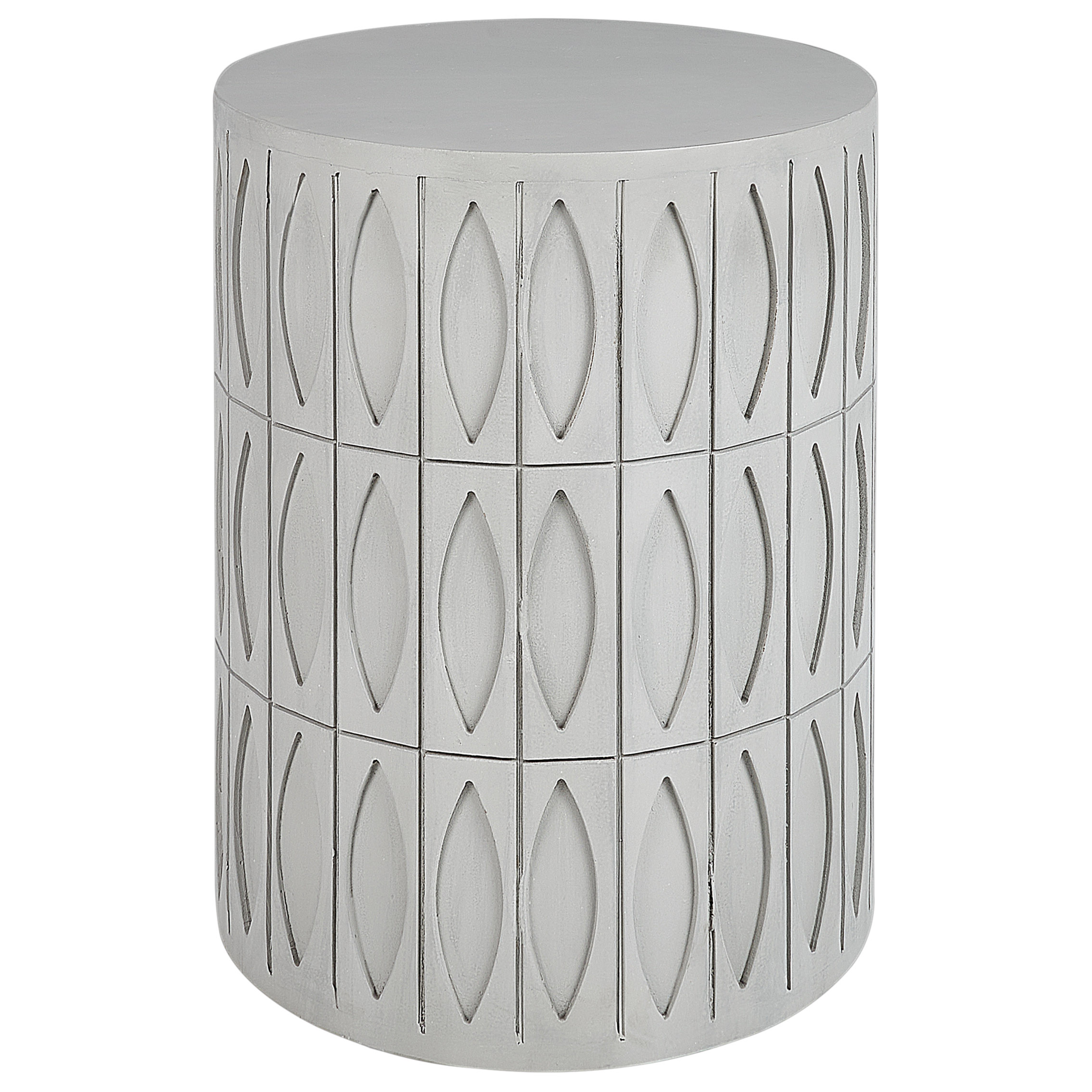 Käsintehty pyöreä sivupöytä. Luo unelmiesi olohuoneen tai makuuhuoneen sisustus tällä tyylikkäällä mutta käytännöllisellä sivupöydällä, joka uudistaa tilan kuin tilan ilmeen. Siinä on kauniisti muotoiltu pohja, jossa on monimutkaisia koristeellisia kuvioita. Se on maalattu upealla vaaleanharmaan väriseksi, joka tuo tilaan ripauksen hienostuneisuutta ja sopii useaan sisustukseen. Laadukkaasta MDF-levystä valmistettu pöytä on paitsi kestävä myös kevyt, joten sitä on helppo liikutella tarpeen mukaan.