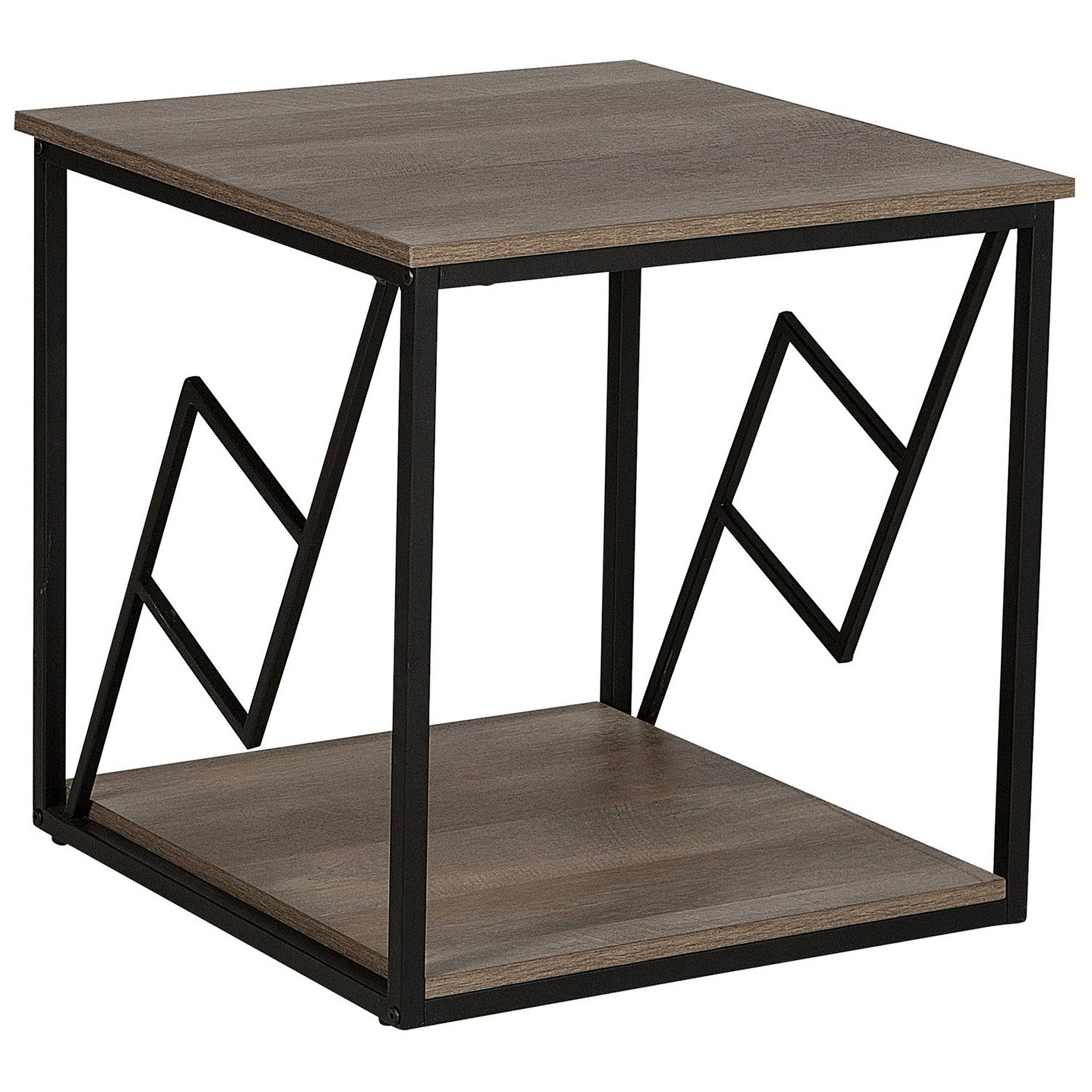 Industriaalinen sivupöytä hyllyllä. Modernia ja industriaalista muotoilua täydellisesti yhdistelevä sivupöytä toimii tyylikkäänä lisänä missä tahansa olohuoneessa tai makuuhuoneessa. Alaosassa sijaitsevalla hyllyllä voit säilyttää pienillä tavaroilla täytettyä koria, tarpeellisia esineitä tai koristeita. Tumman puun sävyinen laminointi korostaa metallirunkoa kauniisti, saaden sivupöydän sopimaan urbaaneihin sekä rustiikkisiin tiloihin.
