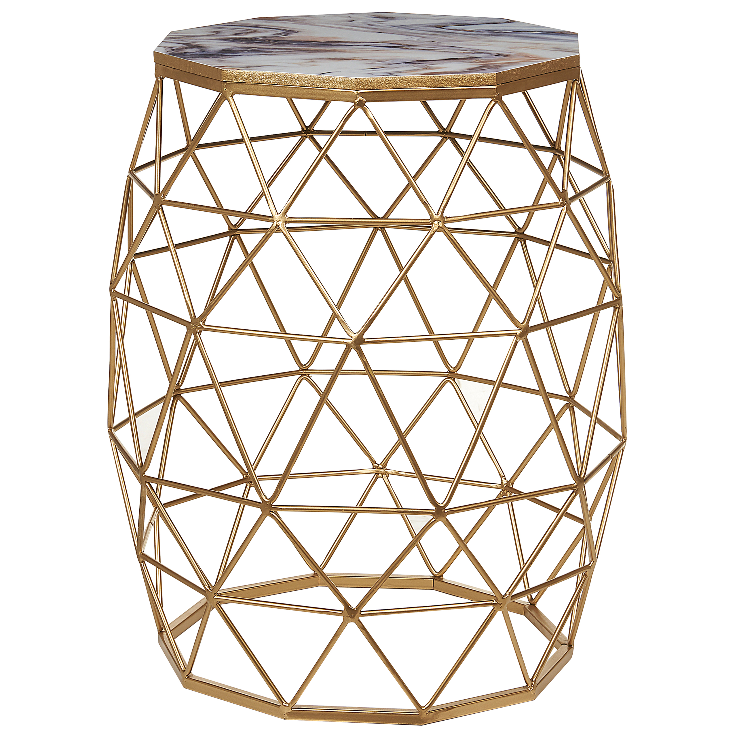 Moderni pyöreä sivupöytä. Tämä sivupöytä sopii loistavasti mihin tahansa tilaan, olohuoneesta eteiseen. Muotoilunsa ansiosta se on sekä käytännöllinen että tyylikäs, katseita keräävä koroste. MDF-levystä valmistetussa pöytälevyssä on kaunis marmorikuvioitu viimeistely, joka yhdessä kullanvärisen rautarungon kanssa antaa sivupöydälle ylellisen ilmeen. Muotoilunsa ja kuviointinsa ansiosta se sopii täydellisesti moderneihin ja glamour-tyylisiin sisustuksiin.