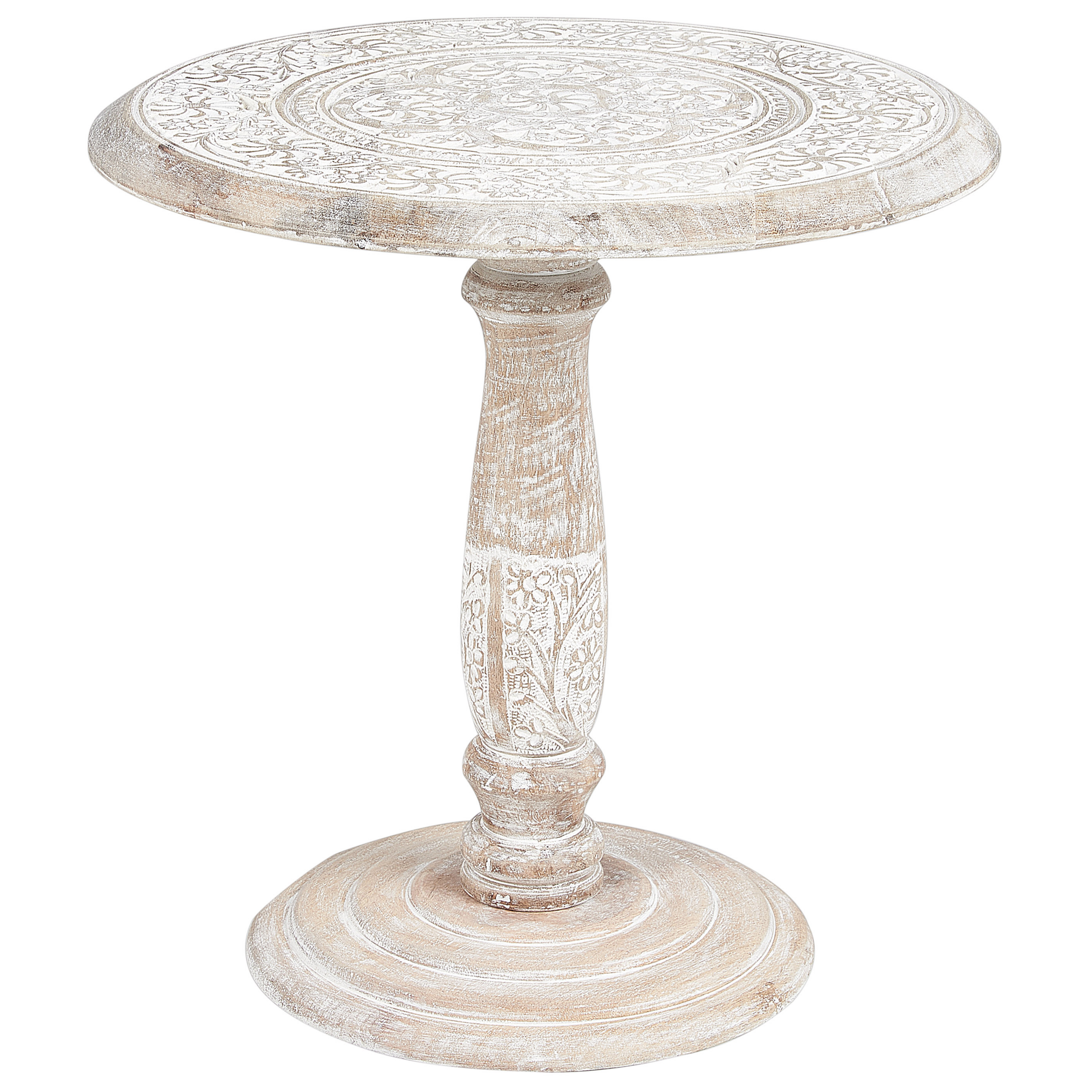 Orientaalinen pyöreä sivupöytä. Viimeistele olohuoneen, eteisen tai makuuhuoneen sisustus tällä kauniilla mutta käytännöllisellä sivupöydällä. Se on valmistettu käsin huolella luonnollisesta mangopuusta, joka tekee siitä erittäin tukevan ja kestävän, myös jokapäiväiseen käyttöön. Koristeelliset kaiverrukset sekä haalistunut valkoinen pintamaali antavat pöydälle vintage-ilmeen.