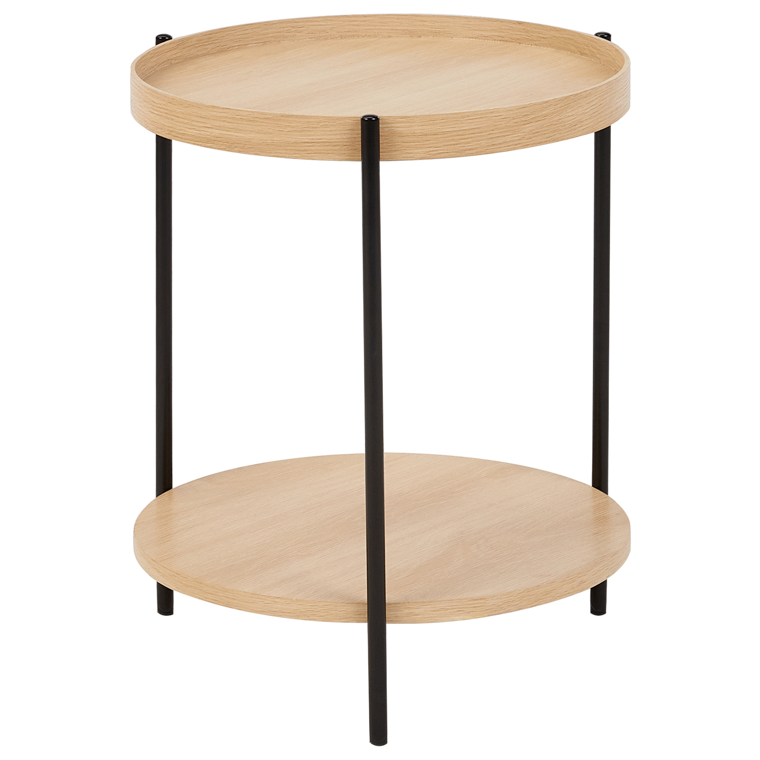 Rustiikkinen pyöreä pikkupöytä hyllyllä. Tämä pyöreä sivupöytä yhdistää luonnollista charmia ja modernia muotoilua. Pöytälevyssä on korotetut reunat, jotka saavat tason muistuttamaan tarjotinta. Luonnollista puuta muistuttava viimeistely antaa pöydälle lämpimän ilmeen ja tekstuuria. Tukevat mustat rautajalat tarjoavat vakautta, ja muoviset suojukset suojaavat lattioita naarmuilta. Sivupöytä sopii erinomaisesti välttämättömien tavaroiden säilyttämiseen tai koristeiden esillepanoon, tuoden ripauksen luonnon inspiroimaa eleganssia mihin tahansa olohuoneeseen.