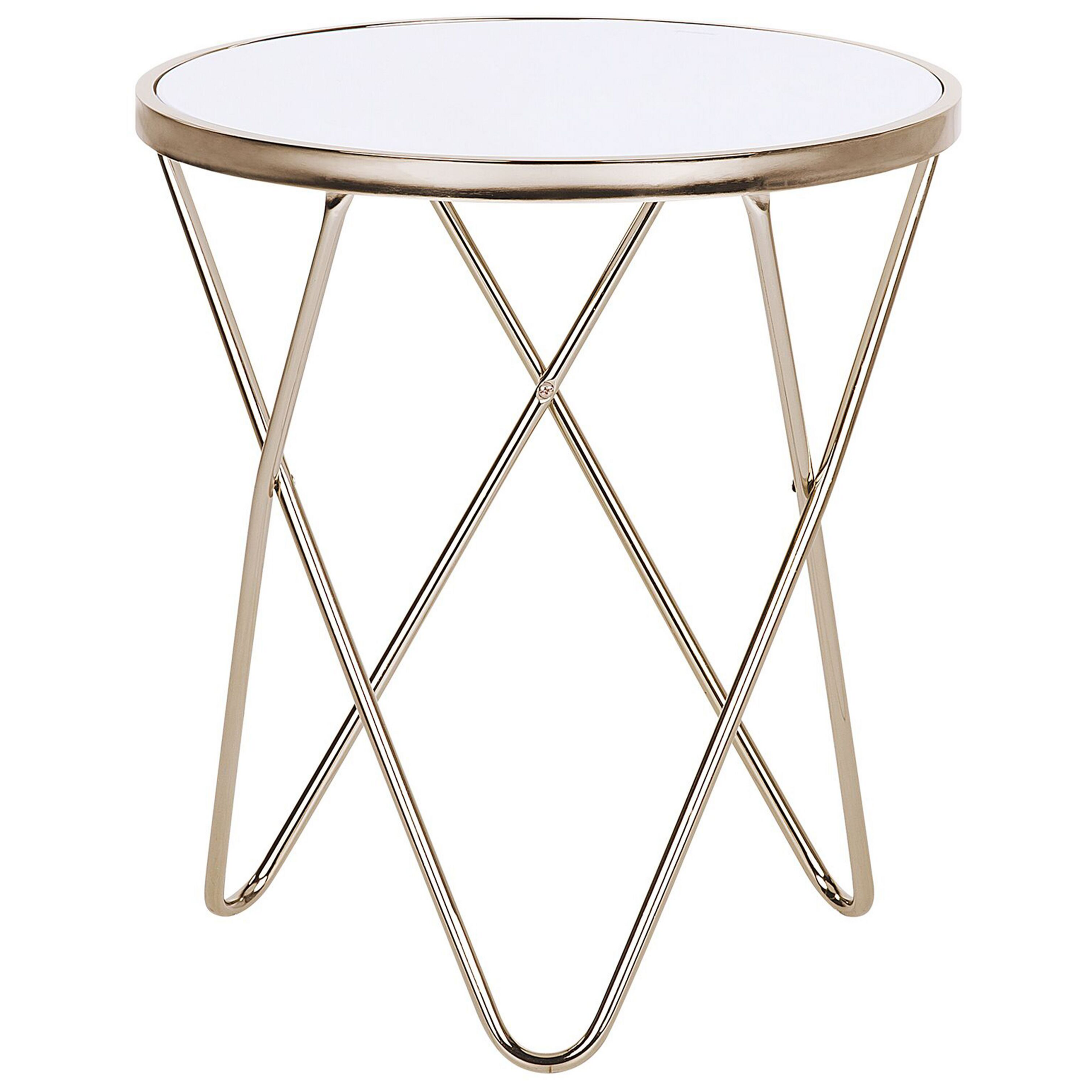 Glamour-tyylinen pyöreä sivupöytä. Tällä sivupöydällä tuot olohuoneeseesi art deco -tyyliä ja vuosisadan puolivälin hohtoa. Pyöreän pöydän kullanväriset metallipinnijalat ja valkoinen karkaistu lasitaso antavat muotoilulle ylellisen ja rikkaan ilmeen. Tämä ajaton sivupöytä täydentää mitä tahansa modernia, glamour- tai retrotyylistä sisustusta kiiltävän viimeistelynsä ansiosta.