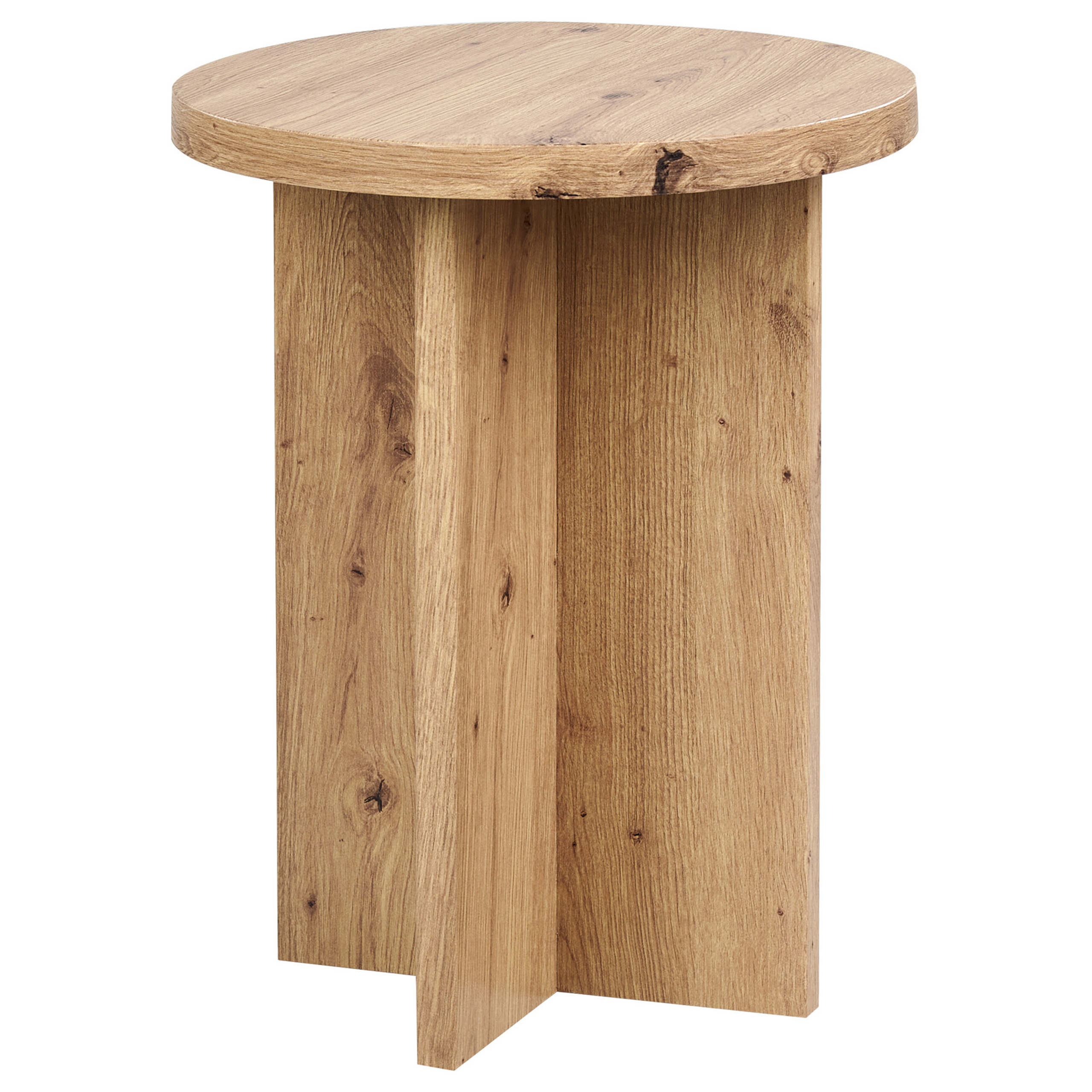 Pyöreä sivupöytä X-jalustalla. Tämä moderni sivupöytä sopii moniin eri nykyaikaisiin sisustustyyleihin. MDF-levystä valmistettu pyöreä pöytälevy tarjoaa tilaa naposteltaville tai koriste-esineille ja X-muotoinen tukeva jalusta takaa vakauden. Pöydän puuefekti tuo ajatonta klassista ilmettä tilaan, kestäen samalla vuosien käytön korkealaatuisten materiaalien ansiosta.