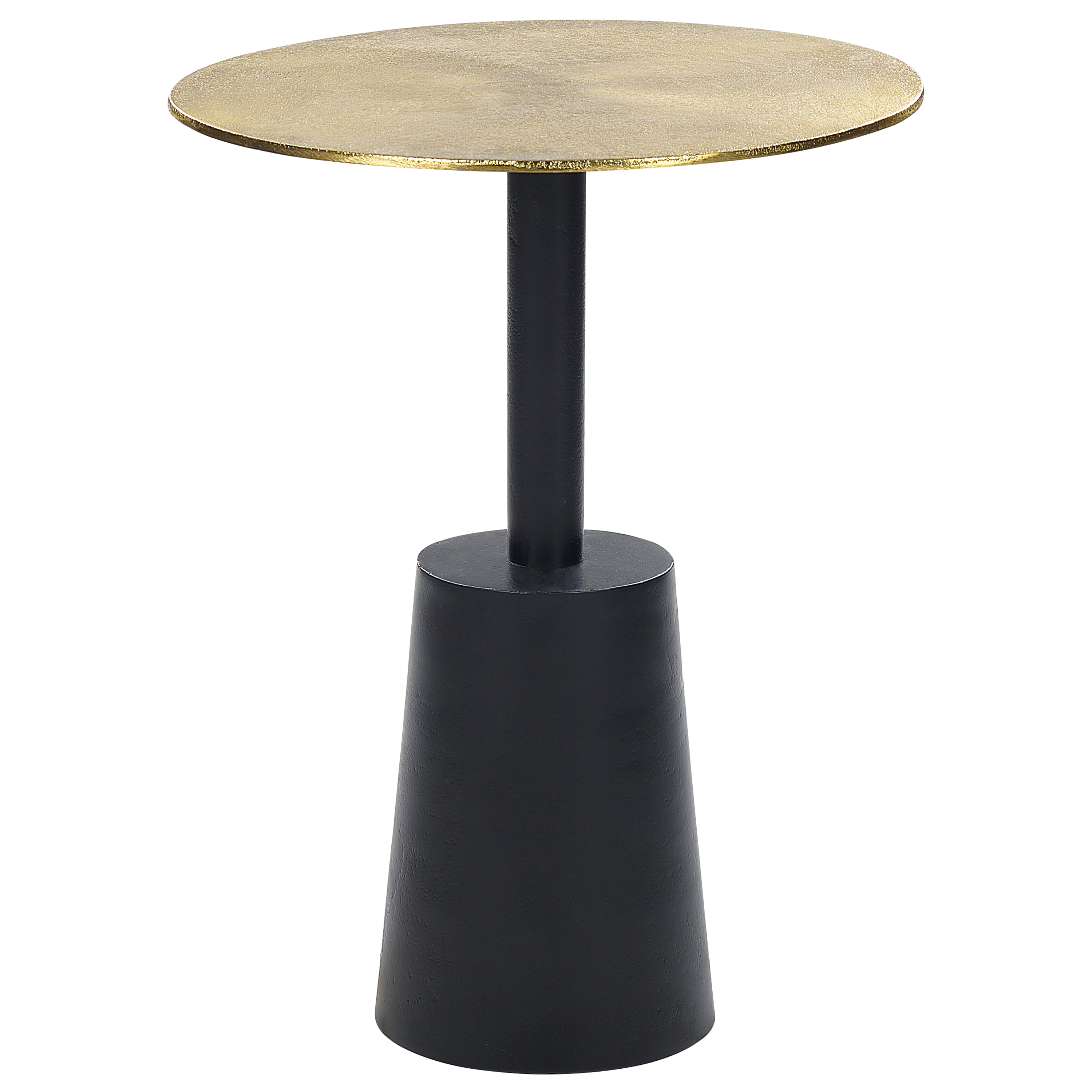 Moderni pyöreä sivupöytä. Ainutlaatuisesti muotoiltu sivupöytä sopii loistavasti kaikkiin moderneihin sisustuksiin. Alumiinista valmistettu pöytä koostuu mustasta pyöristetystä jalustasta, lyhyestä jalasta sekä kullanvärisestä, hieman kuluneesta pöytälevystä, joiden ansiosta se on vankka sekä visuaalisesti kevyt. Sivupöytä sopii loistavasti olohuoneeseen, jossa voit käyttää sitä sohvan vieressä pienenä sohvapöytänä tai asettaa sen muualle yhdessä erilaisten koristeiden ja kasvien kanssa.