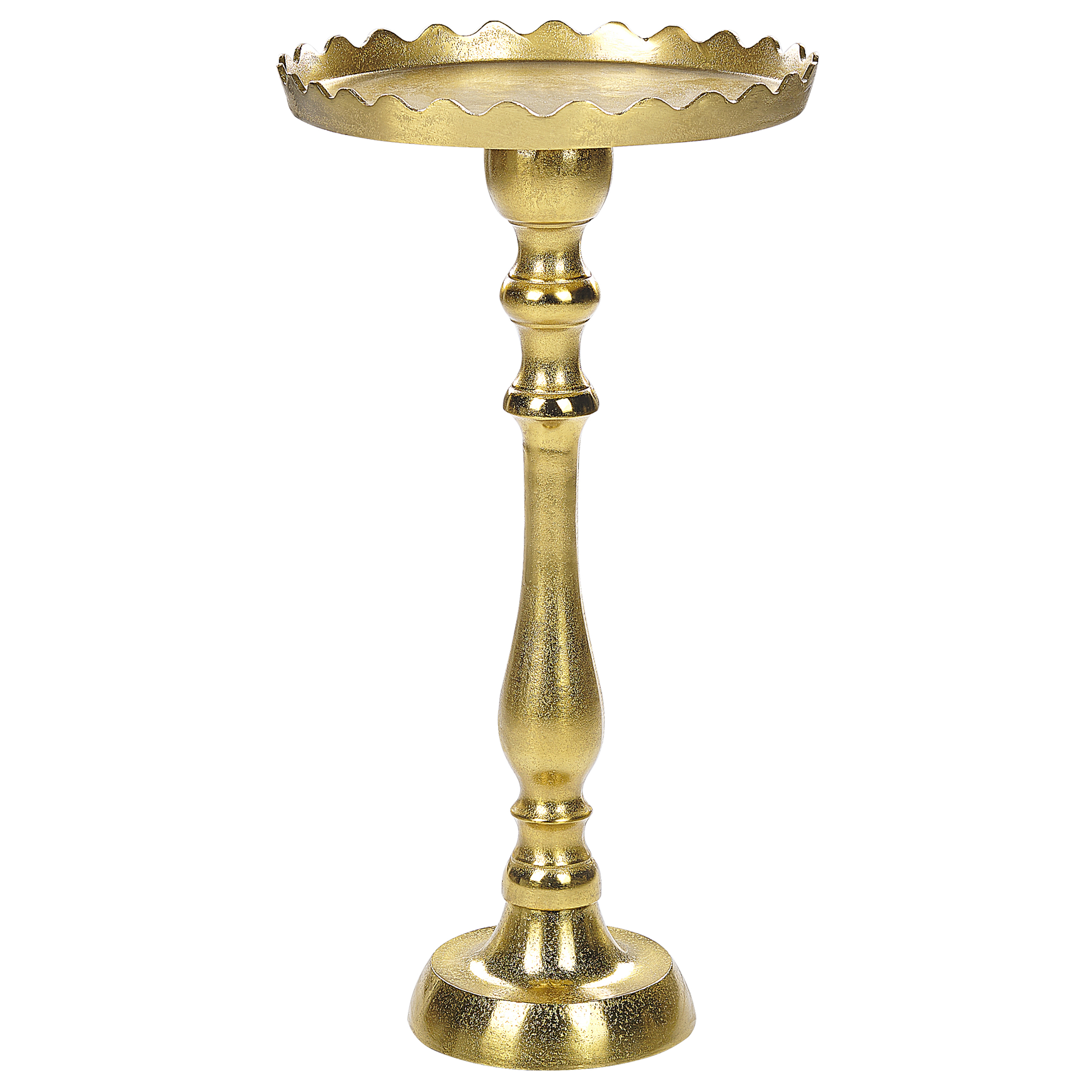 Moderni pyöreä sivupöytä. Lisää glamour-tunnelmaa kotiisi tällä tyylikkäällä sivupöydällä. Sen tarjotinta muistuttava pöytälevy tarjoaa paikan kahvikupille tai erilaisille sisustustarvikkeille ja kasveille. Koristeellinen jalka ja kiiltävä, kultainen viimeistely antavat sivupöydälle ylellisen ilmeen, joka sopii erityisen hyvin moderneihin tai vintage-tyylisiin tiloihin. Koko pöytä on valmistettu kestävästä alumiinista, jonka ansiosta se on sekä vankka että kevyt.