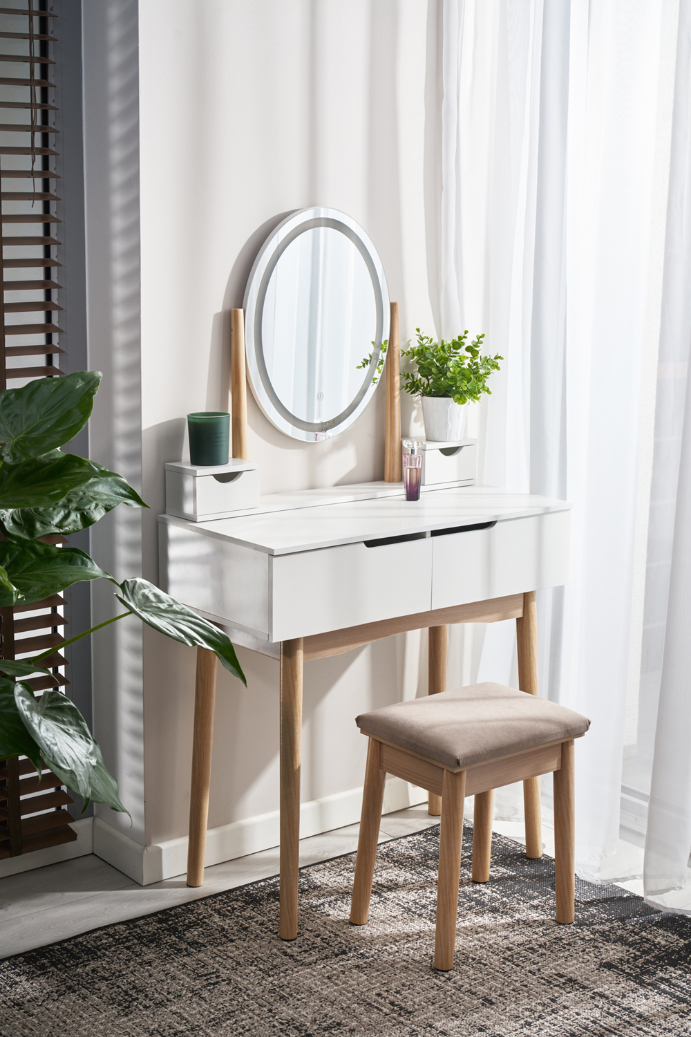 Tämä huonekalu sopii täydellisesti makuuhuoneeseen käytännölliseksi tilaksi meikkaamiseen, hiusten muotoiluun, päivittäisiin kauneusrutiineihin sekä kirjeen kirjoittamiseen tai erilaisten pikkutavaroiden säilyttämiseen.