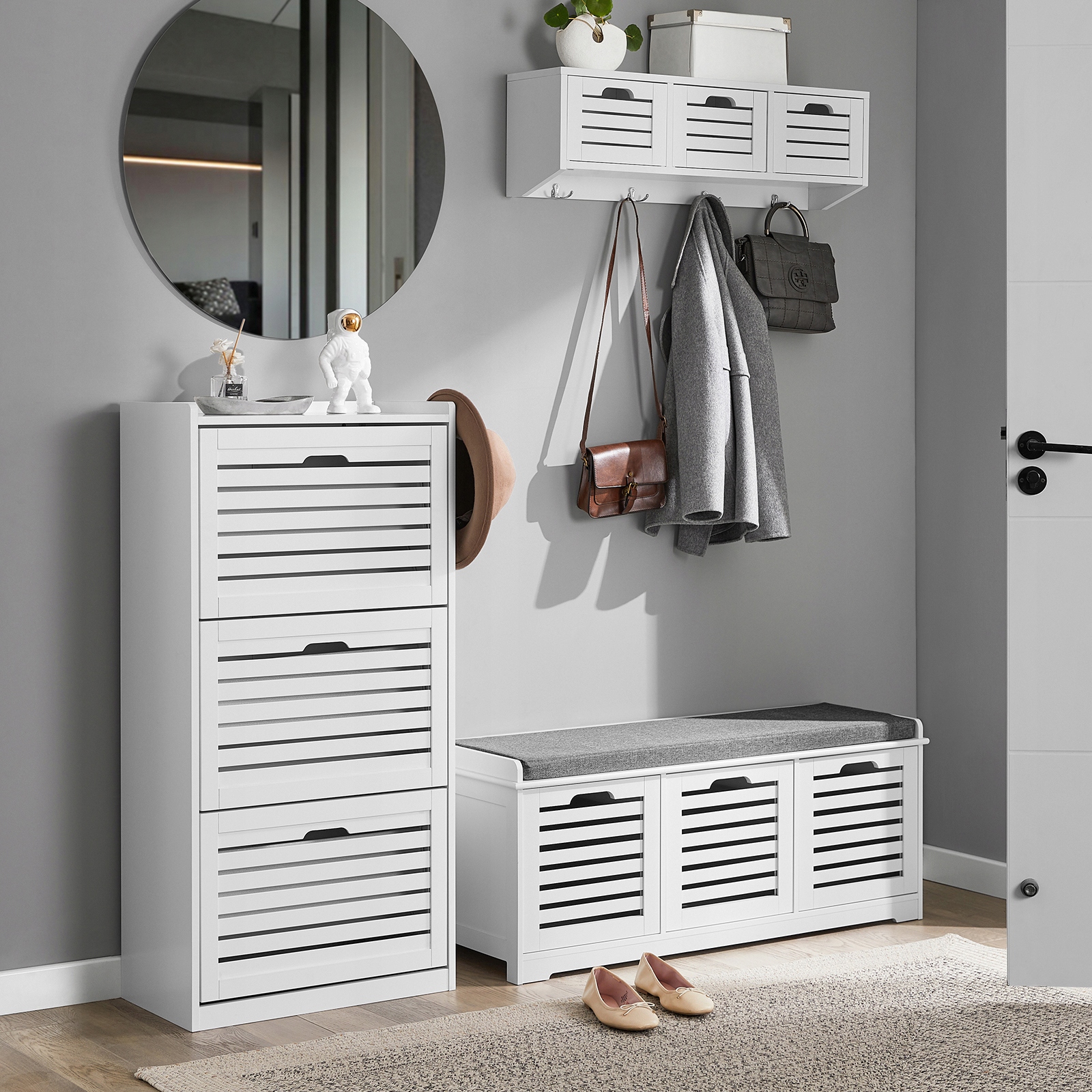 SoBuy 3-oven kenkäkaappi yhdistää tyylikkään pohjoismaisen designin ja käytännöllisyyden. Kompakti mutta tilava malli sopii erinomaisesti kapeisiin eteisiin ja käytäviin, säilyttäen samalla kaiken tyylin. Valkoinen akrylaattilakka antaa modernin ja raikkaan kosketuksen sisustukseesi.