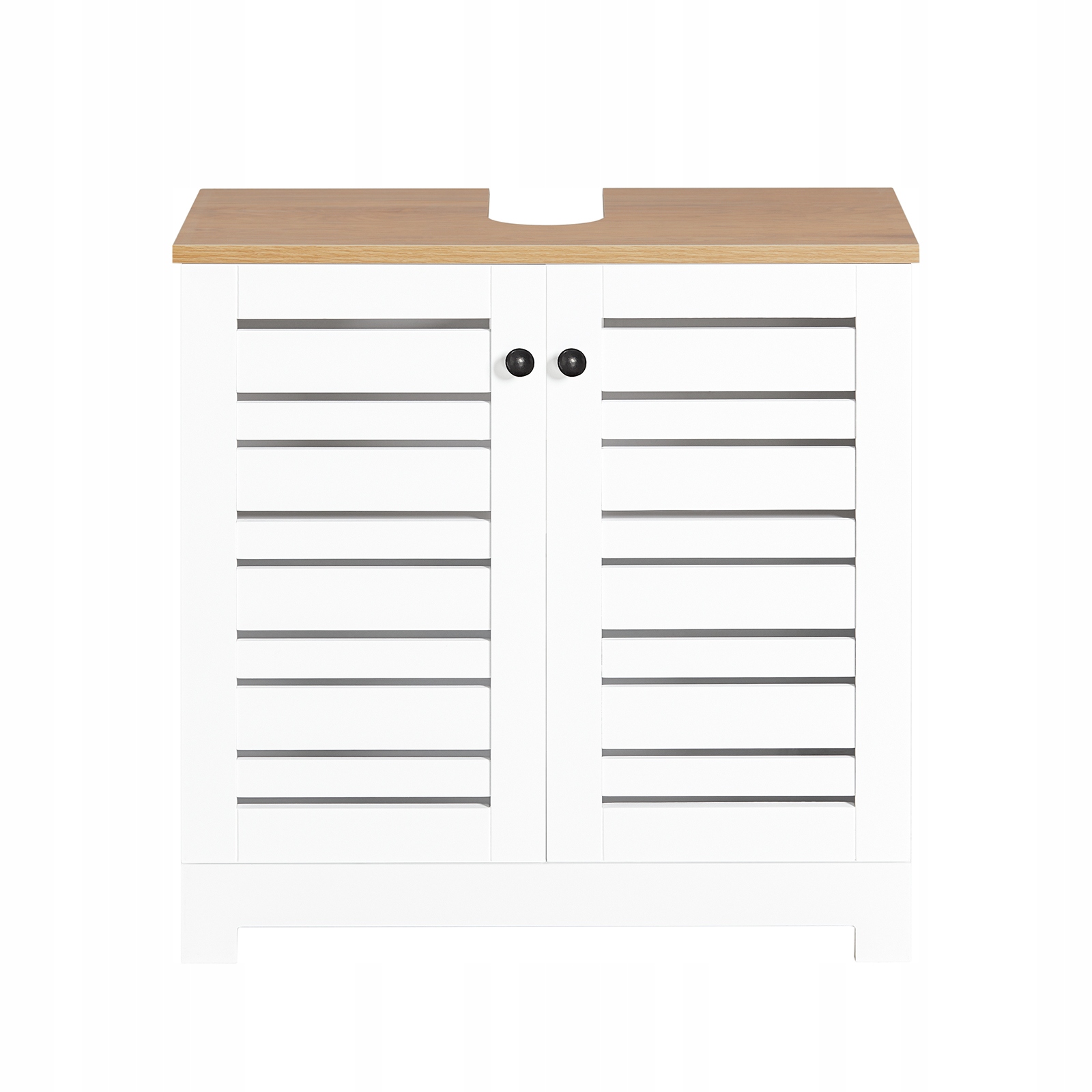 SoBuyn käytännöllinen ja tyylikäs pesualtaiden alla sijoitettava kaappi tuo siisteyden ja järjestyksen kylpyhuoneeseesi. Sen avulla voit helposti piilottaa hygieniatuotteet ja säilyttää pesuaineet, siivousvälineet sekä muut kylpyhuonetarvikkeet siististi. Kaapin takana oleva putkiaukko mahdollistaa sen asennuksen altaan alle, peittäen häiritsevät putkistot.