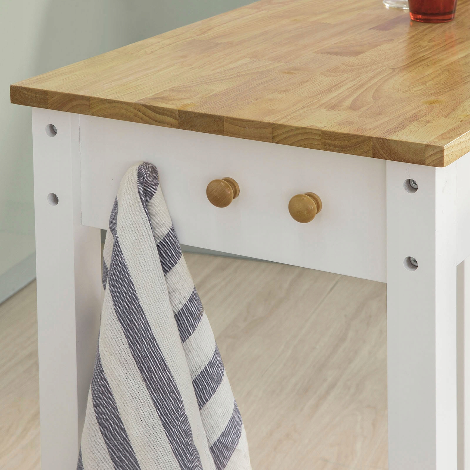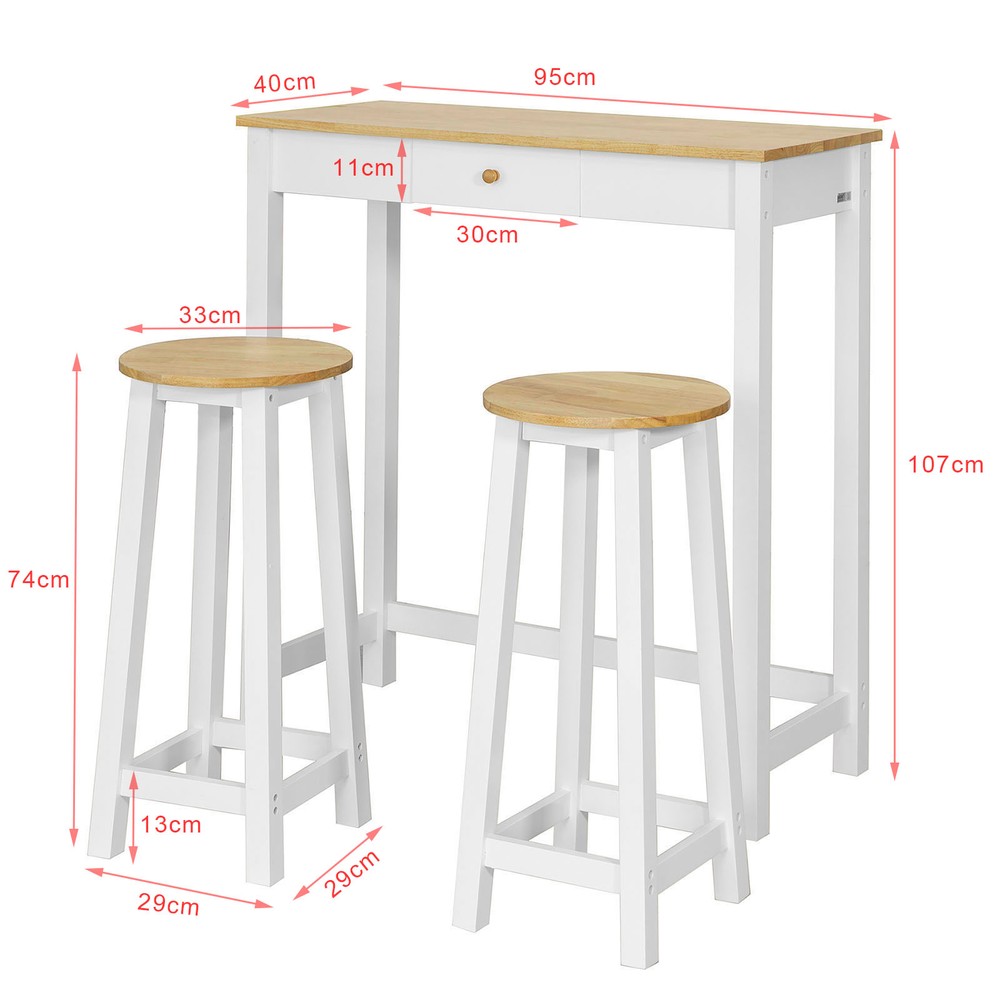 SoBuy:n moderni baaripöytäsetti tarjoaa täydellisen yhdistelmän tyylikkyyttä ja käytännöllisyyttä. Pöydän tilava pinta (95x40 cm, korkeus 107 cm) soveltuu ihanteellisesti kahden hengen brunsseille, työskentelylle tai rentoutumiselle. Alapuolella oleva kätevä laatikko mahdollistaen esimerkiksi aterimien siistin säilytyksen.