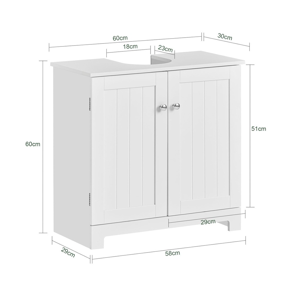 Kaapissa on kaksi pöly- ja kosteussuojattua lokeroa pyyhkeille ja WC-tarvikkeille, sekä korkeussäädettävä hylly. Magneettilukko pitää ovet luotettavasti kiinni. Kaappi on suunniteltu pesualtaan alle asennettavaksi, peittämään häiritsevät putkistot.