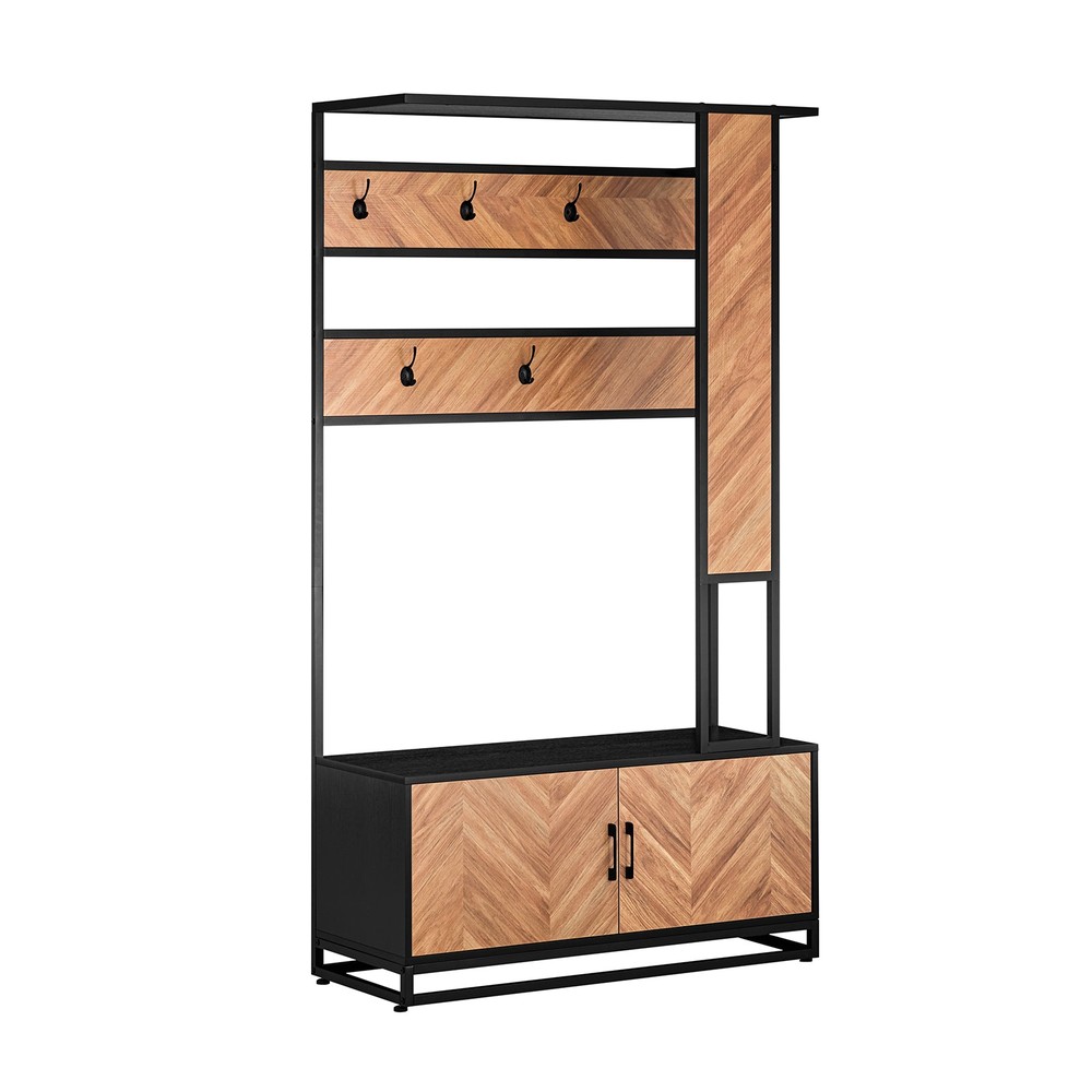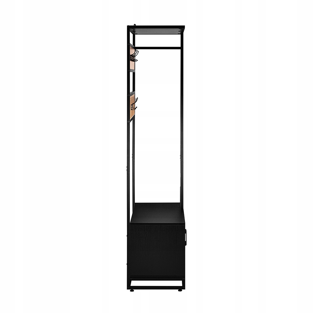 5 koukkua, vaatepuomi, avoin ja suljettu säilytystila. Metallirunko ja säädettävät jalat vakauteen. Sopii käytäviin ja oviaukoihin.