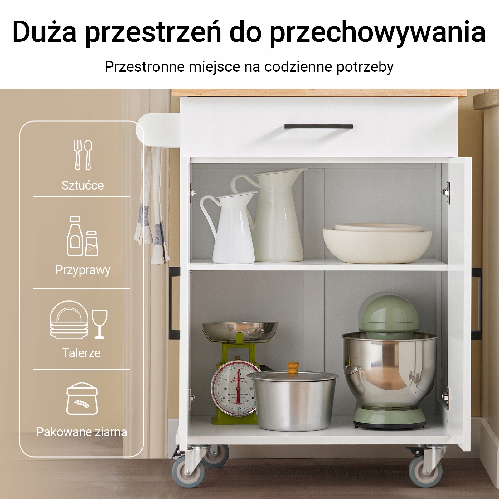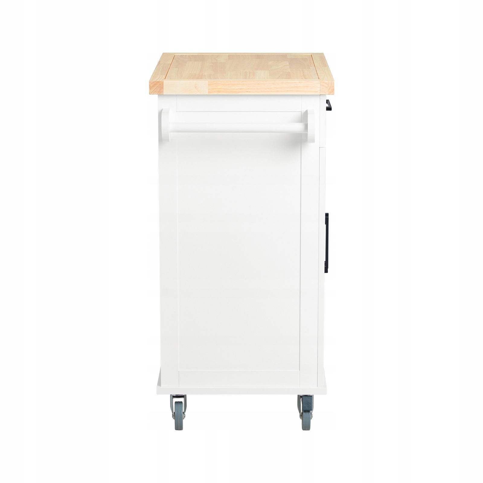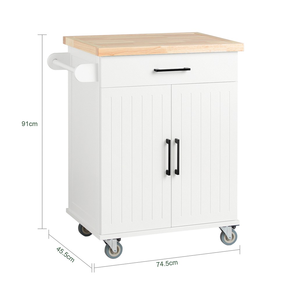 Tämä monikäyttöinen kärry sisältää 1 syvän laatikon, 2 suljettua kaappia sekä säädettävän työtason, joten voit mukauttaa sen täydellisesti tarpeisiisi. Vankka heveapuinen työtaso on ihanteellinen ruoanlaittoon tai kodinkoneiden sijoittamiseen.