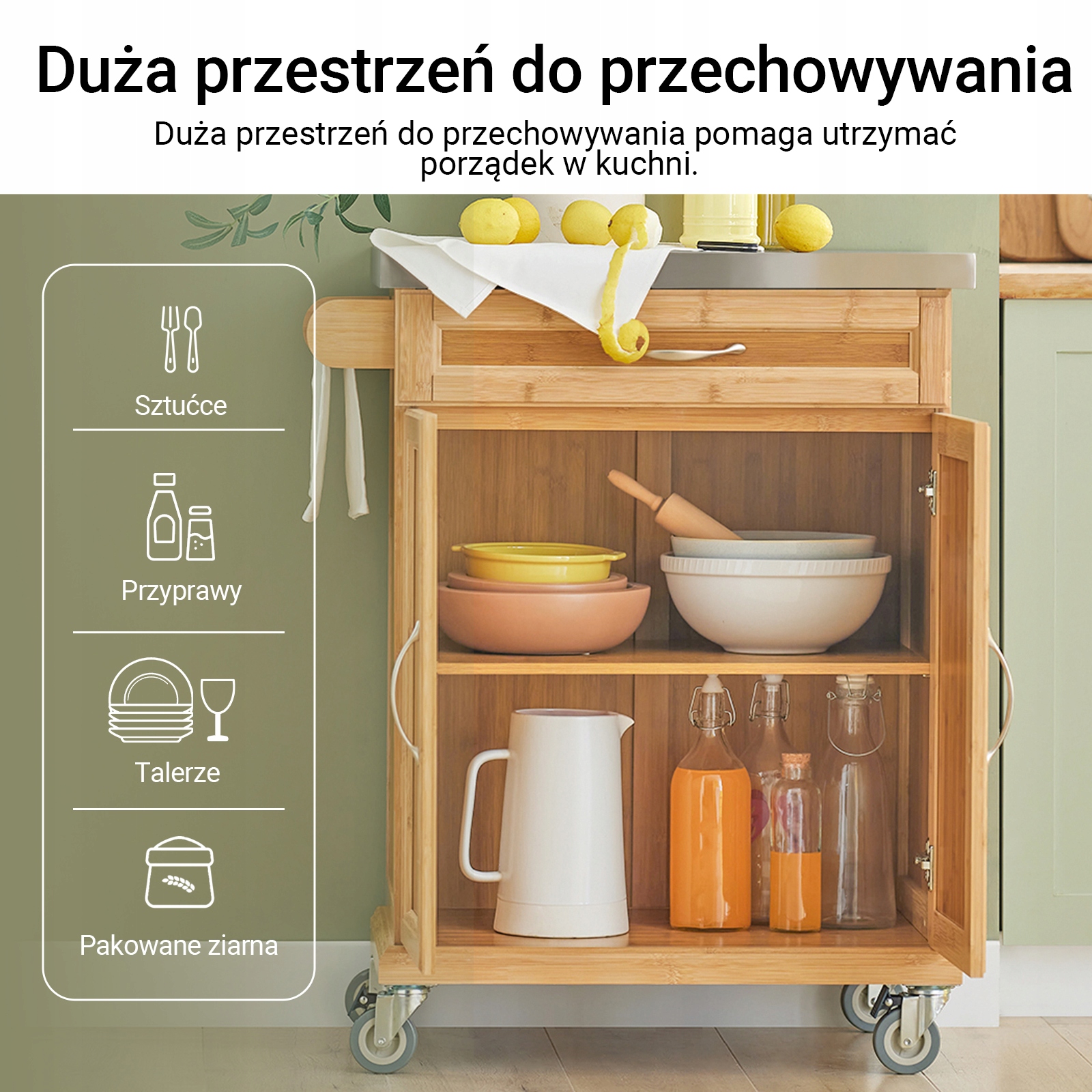 Kestävä bambu- ja teräsrakenne sekä jopa 80 kg:n kantavuus takaa pitkäikäisen käytön. 360° pyörivät pyörät mahdollistavat helpon liikuttelun, ja jarrulliset pyörät pitävät kärryn paikallaan tarvittaessa. Pohjoismaisen ekologisen suunnittelun hengessä materiaalit on valittu kestävästi.