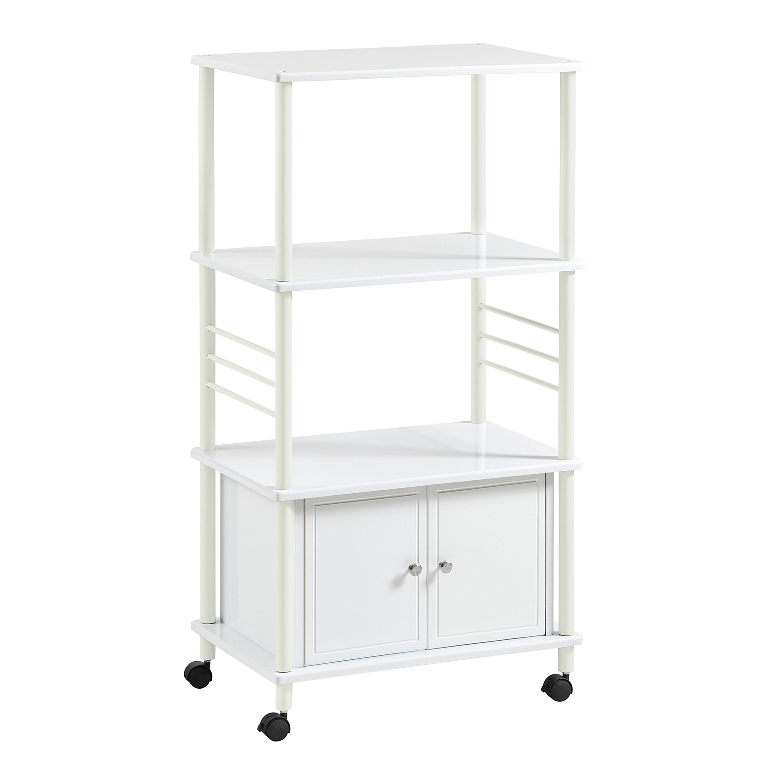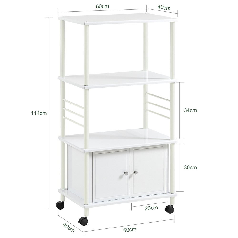 4 pyöräistä järjestelmää mahdollistaa helpon liikuttelun, ja lukittavat pyörät varmistavat vakauden käytön aikana. Säädettävät hyllyt tarjoavat joustavuutta erikokoisille esineille. Käytännöllinen mikroaaltouunitila (L60×P40×K34 cm) sopii lähes kaikkiin mikroaaltouuneihin.