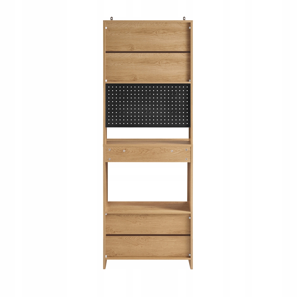 Tämä monipuolinen SoBuy-keittiökaappi on täydellinen ratkaisu keittiön tai ruokailutilasi järjestämiseen. Sen korkeus on 170 cm, leveys 60 cm ja syvyys 40 cm, tarjoamalla runsaasti säilytystilaa useilla tasoilla. Korkealaatuinen vintage-tyylin puukuvioinen suunnittelu tuo keittiöösi ajanlessen elegantin ilmeen. Kaapissa on erityinen mikroaaltouunille suunniteltu kohta, kaksi käytännöllistä laatikkoa ja yläkaappi kahdella ovella. Erityisen kätevä on integroitu naulalauta, joka sopii hyvin keittiövälineiden säilyttämiseen. Vankat mustat kahvat tuovat tyylikkään sävyn ja mahdollistavat mukavan käytön. Tämä keittiökaappi yhdistää huolellisesti suunnitellun toiminnallisuuden houkuttelevaan designiin ja on välttämätön kaluste mihin tahansa moderniin keittiöön.