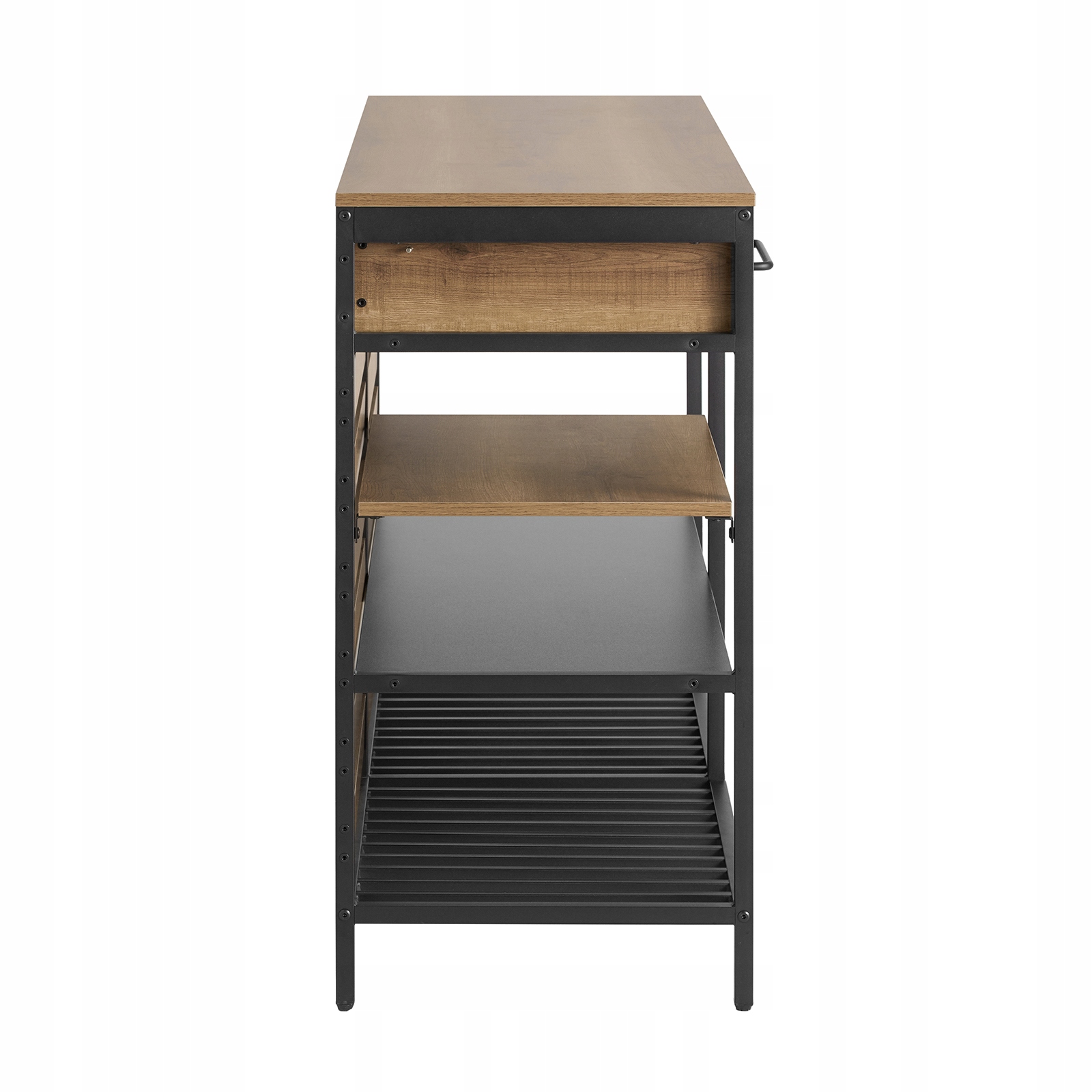 Laadukkaasta E1-luokitellusta lastulevystä ja jauhemaalatusta teräsrungosta valmistettu huonekalu tarjoaa runsaan säilytystilan: 2 laatikkoa, 3 avointa hyllyä ja tilavan pöytälevyn. Lankkutyylinen taustalevy tuo sisustukseen rustiikkia tyylikkyyttä. Vankat säädettävät jalat varmistavat stabiilin asennuksen epätasaisillakin lattioilla.
