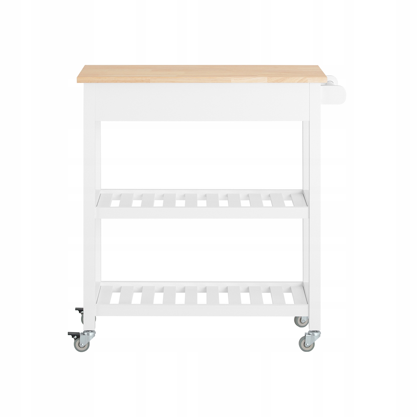 Laadukkaasti suunniteltu vaunu tarjoaa runsaasti säilytystilaa astioille, liinoille ja keittiövälineille. Kahdella kätevällä laatikolla ja kahdella hyllyllä on runsaasti tilaa kaikille tarvikkeillesi. Puinen pöytälevy suojaa vaunua vedeltä, hapettumiselta ja korroosiolta, mikä takaa kestävän käytön.