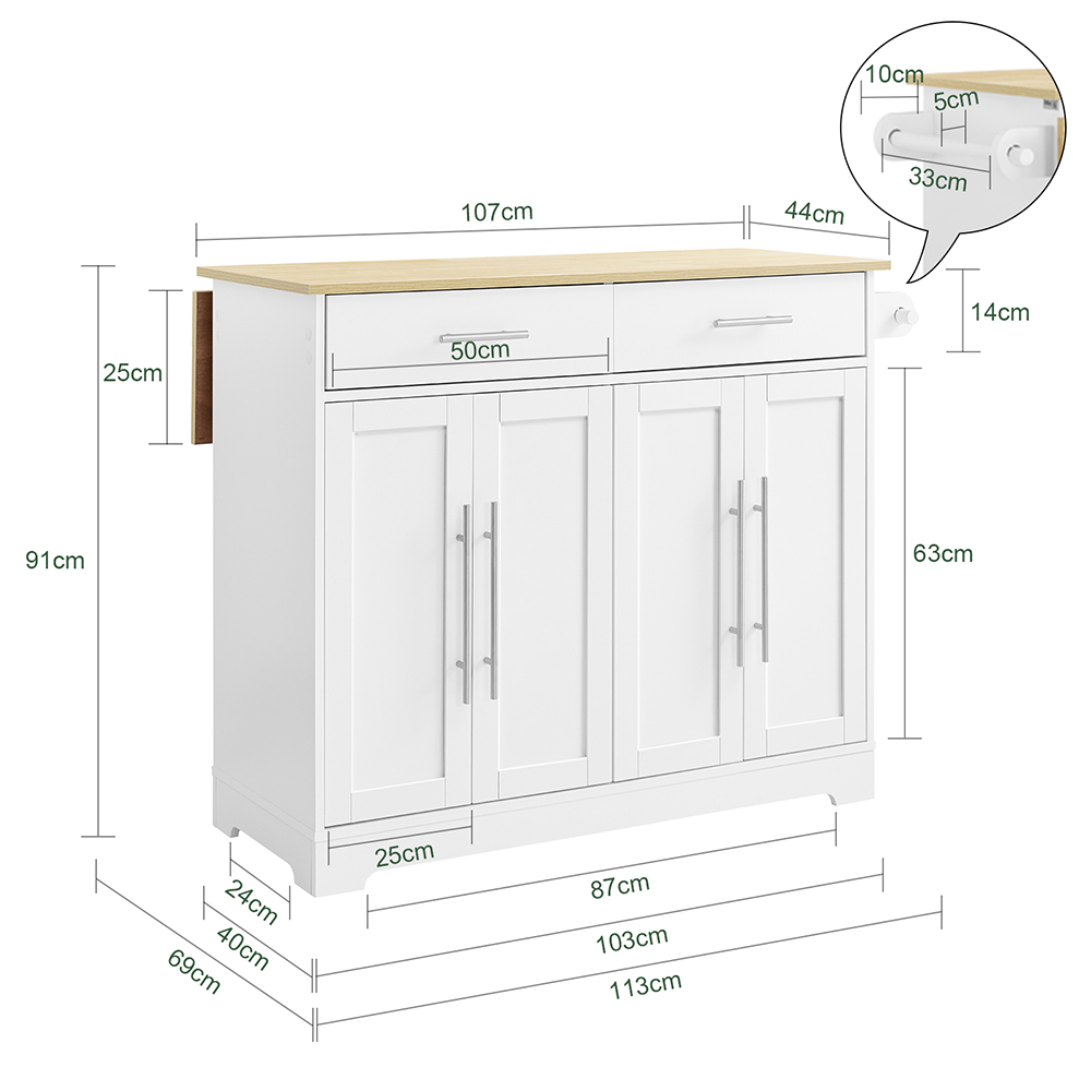 SoBuy Keittiövaunu 2-laatikko puusta laajennettava valkoinen 113x91x44-69 cm FKW129-WW