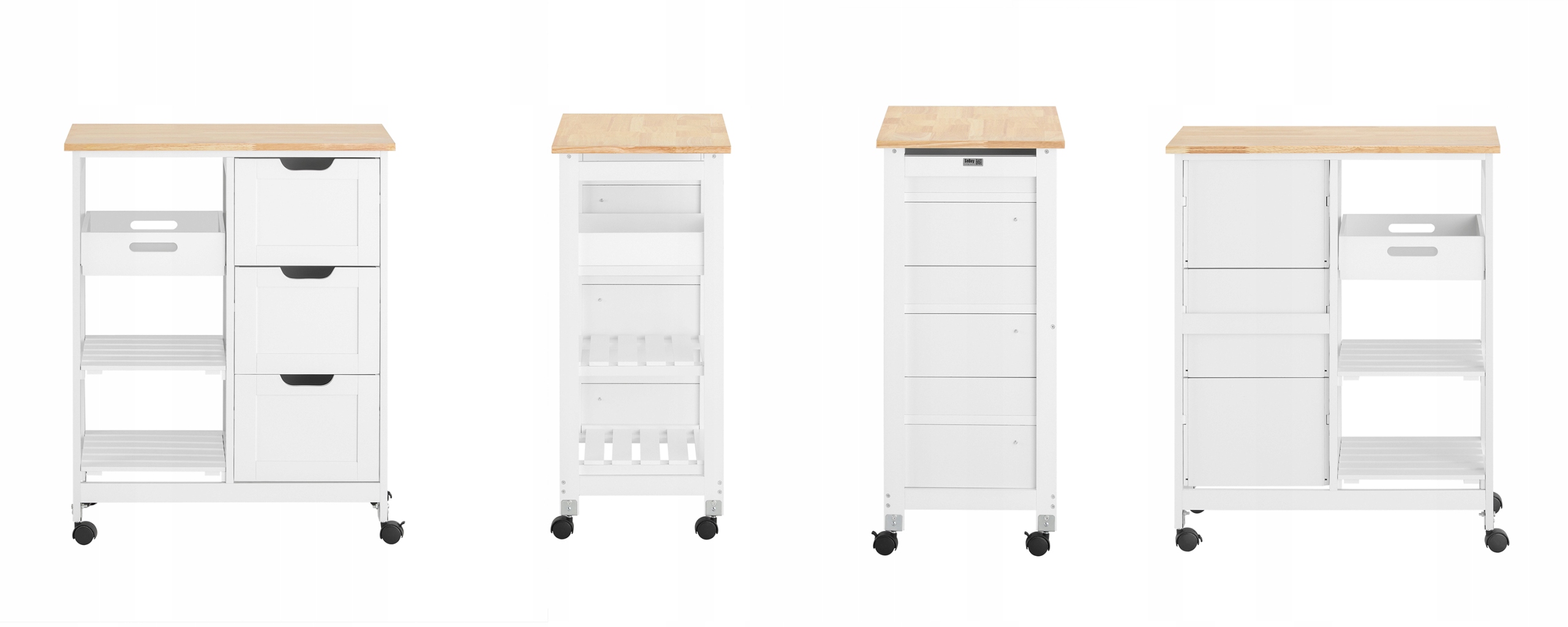 SoBuy:n monikäyttöinen tarjoiluvaunu tuo skandinaavisen designin ja käytännöllisyyden keittiöösi. Kolme kätevää laatikkoa, kaksi hyllyä ja irrotettava kori tarjoavat runsaasti säilytystilaa ruoanlaittovälineille. Lukittavat pyörät mahdollistavat helpon liikuttelun ja vakauden käytön aikana.