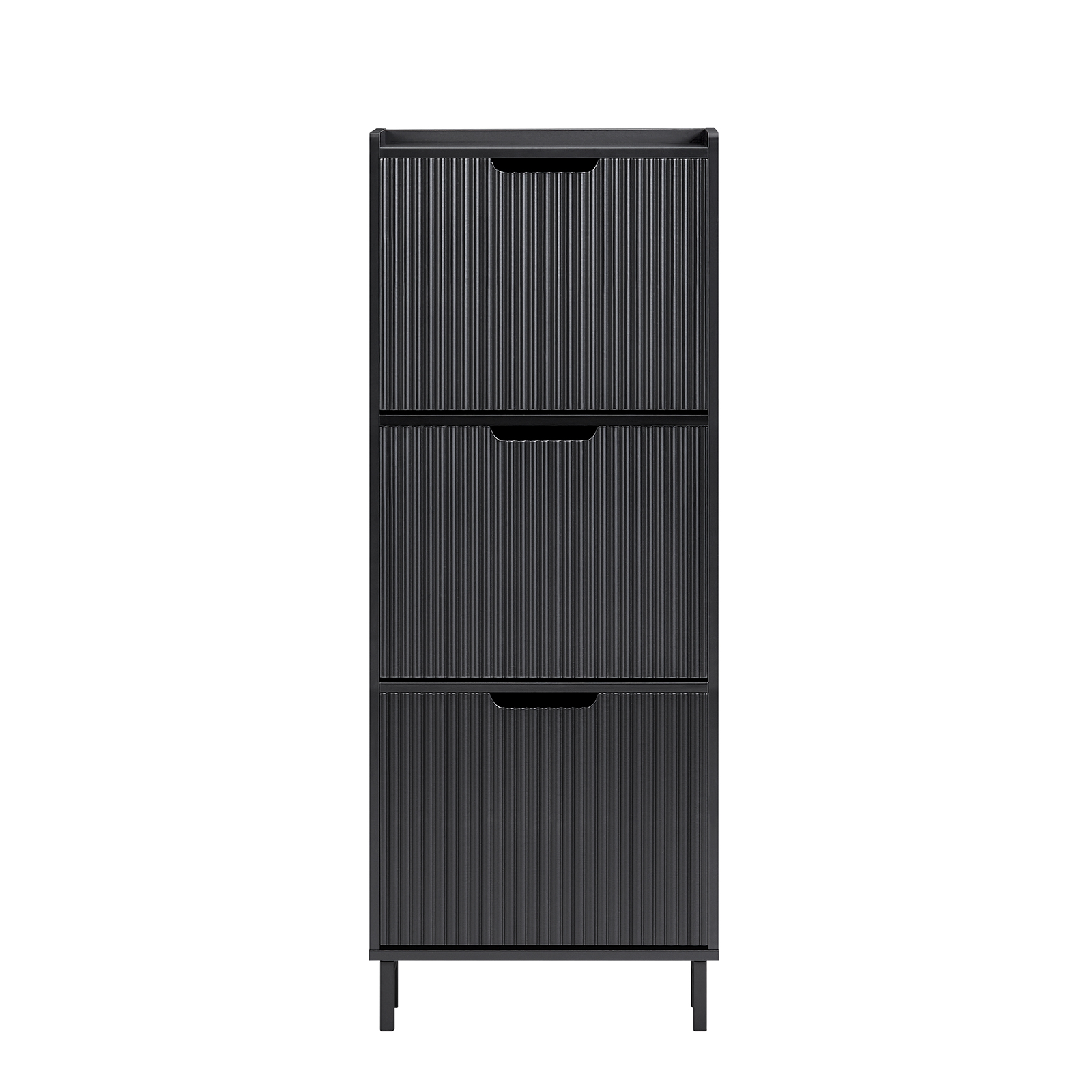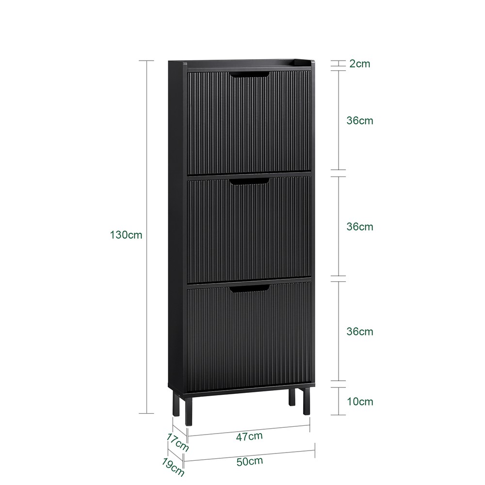 SoBuy:n moderni ja tyylikäs kenkäkaappi tuo järjestyksen ja eleganssin kotiisi. Erittäin ohut 19 cm syvyydellä se sopii täydellisesti kapeisiin eteisiin ja käytäviin säästäen arvokasta tilaa. Kolmella ovella varustettu kaappi tarjoaa runsaan säilytystilan lenkkareille, korkokengille, saappaille ja muille kenkille, samalla kun suljetut ovet suojaavat niitä pölyltä ja värien haalistumiselta.