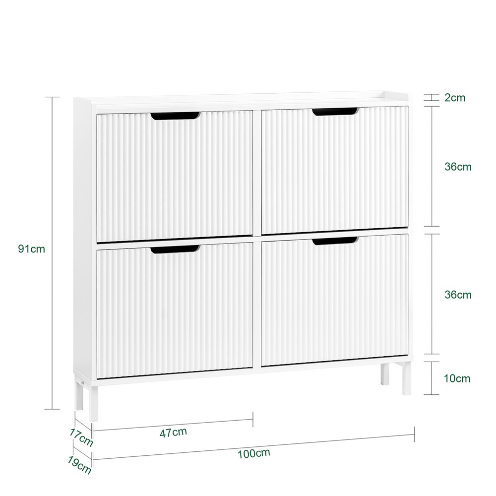 SoBuy:n moderni ja tyylikäs kenkäkaappi tuo järjestyksen ja eleganssin kotiisi! Erittäin ohut, vain 19 cm syvä muotoilu sopii täydellisesti kapeisiin eteisiin ja käytäviin säästäen arvokasta tilaa. Neljä kätevää ovea ja moniosastoisen suunnittelun ansiosta kaappiin mahtuu helposti lenkkarit, korkokengät, saappaat ja muut kengät, pitäen käytävän siistinä ja pölystä vapaana.