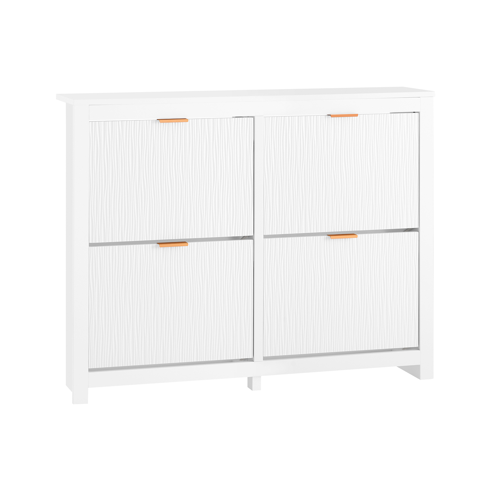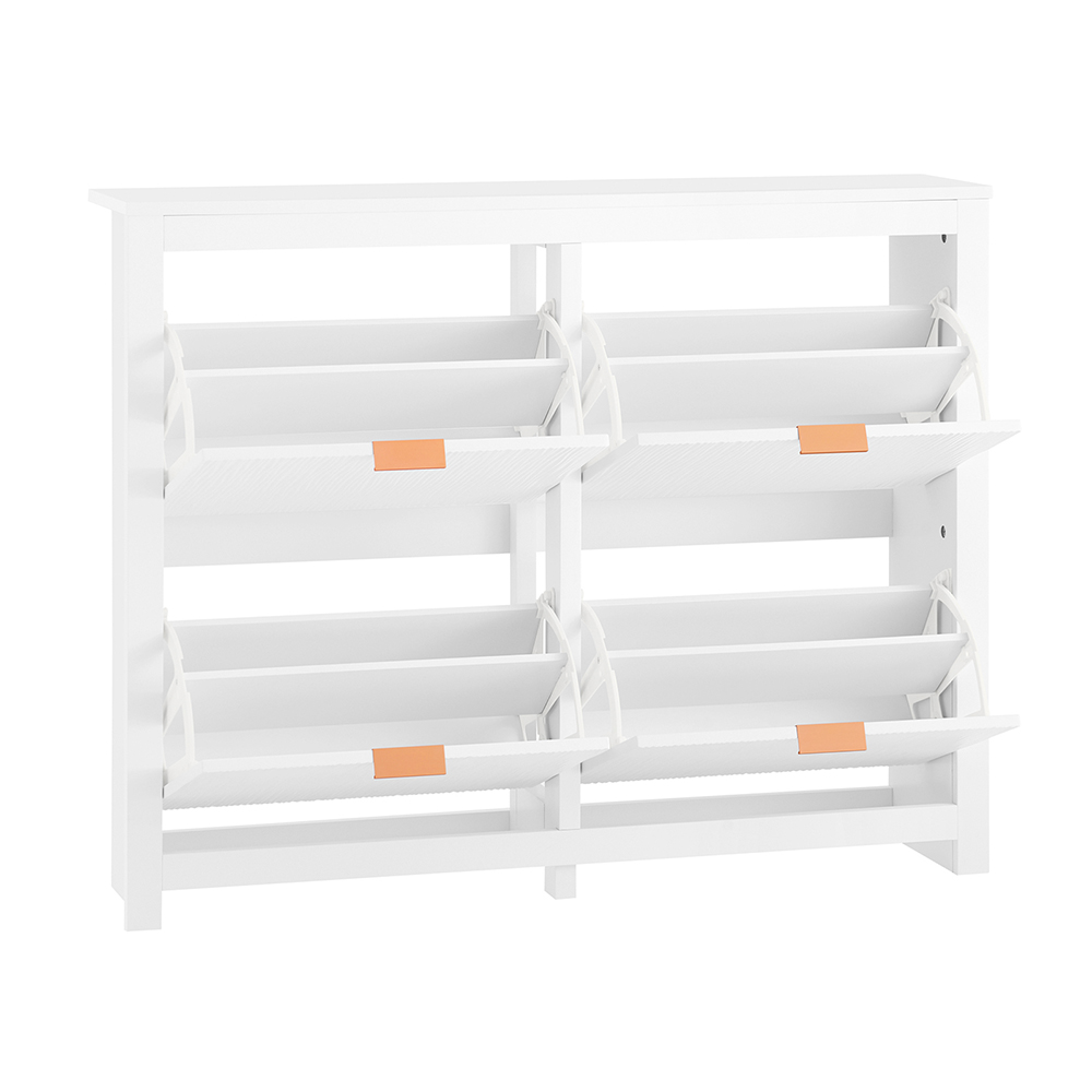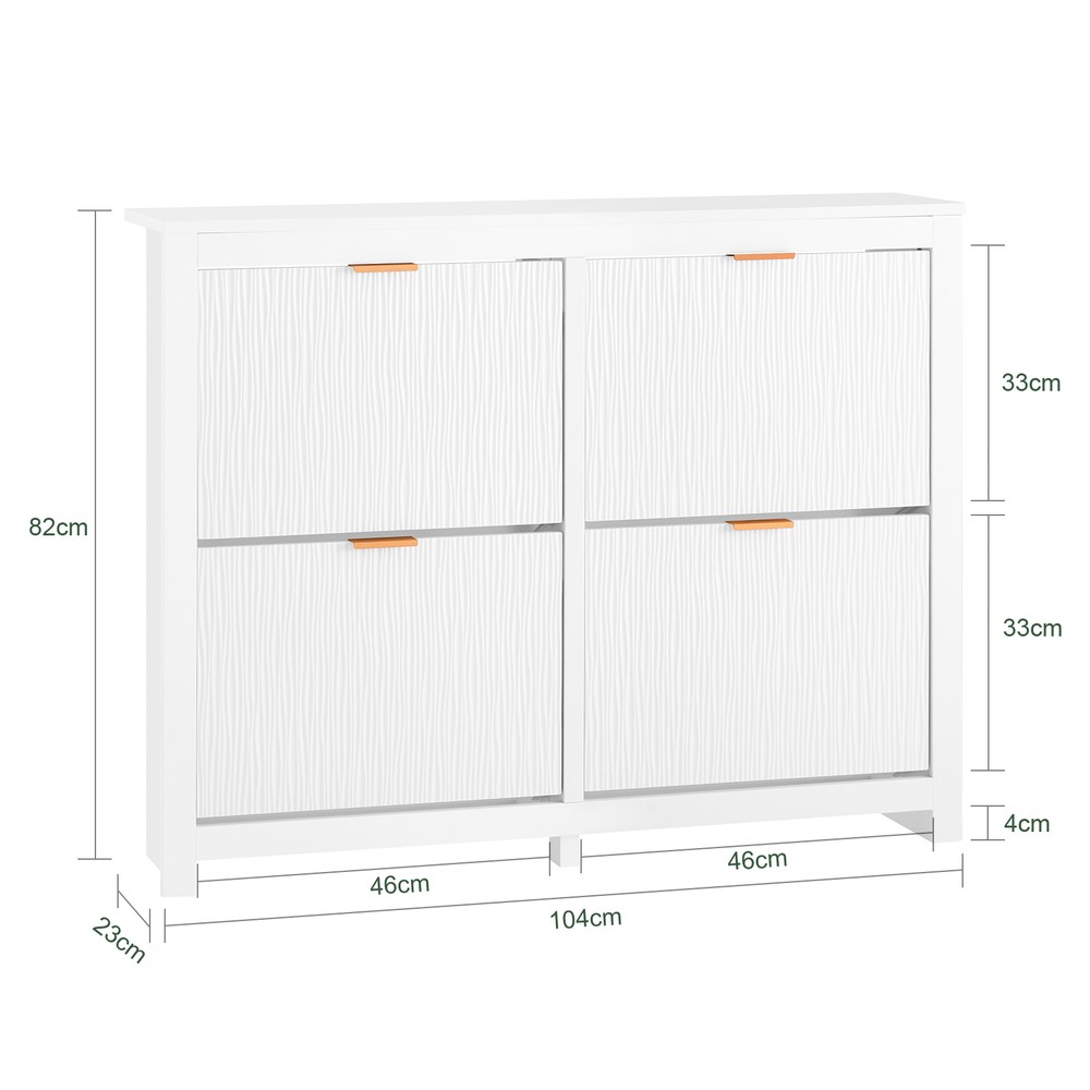 Tässä SoBuy-kenkäkaapissa yhdistyvät käytännöllisyys ja tyylikäs pohjoismainen design. Sen moderni kohokuvioitu oven design tuo huoneeseen muotitiedostuksen ja ajattoman tyylin. Neljä läppäovea ja 8 säädettävää hyllyä tarjoavat runsaasti tilaa kengillesi, jopa korkeimmille saappaillesi. Kaapin hyllyjen korkeutta voidaan säätää tarpeen mukaan, mikä takaa täydellisen järjestyksen kenkäkokoelmallesi.