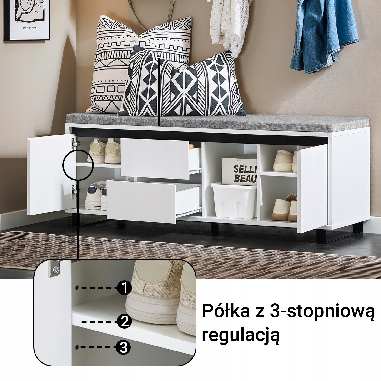 Tämä kenkäpenkki yhdistää käytännöllisyyden ja tyylikkään muotoilun. Kolme säädettävää hyllyä mahdollistavat erikokoisten kenkien säilytyksen. Penkissä on kaksi pientä laatikkoa ja lisäsäilytystila kenkähuollon tarvikkeille.