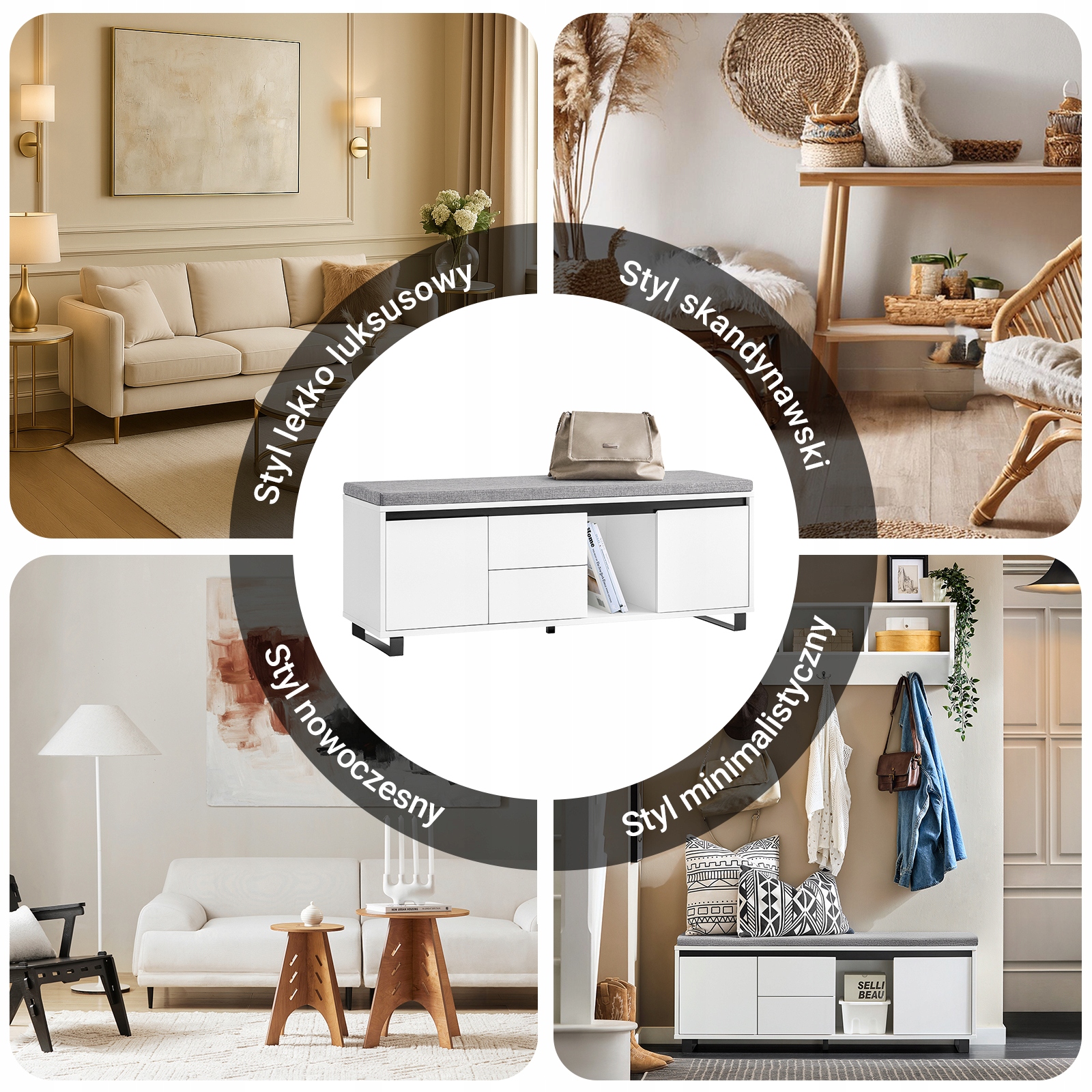 Pehmeä istuinalusta tekee käytöstä mukavan. Valmistettu kestävistä materiaaleista (E1-luokan MDF ja metalli), tuote kestää jopa 262 kg. Valkoinen pinta ja minimalistinen muotoilu sopivat harmonisesti sisustukseen.