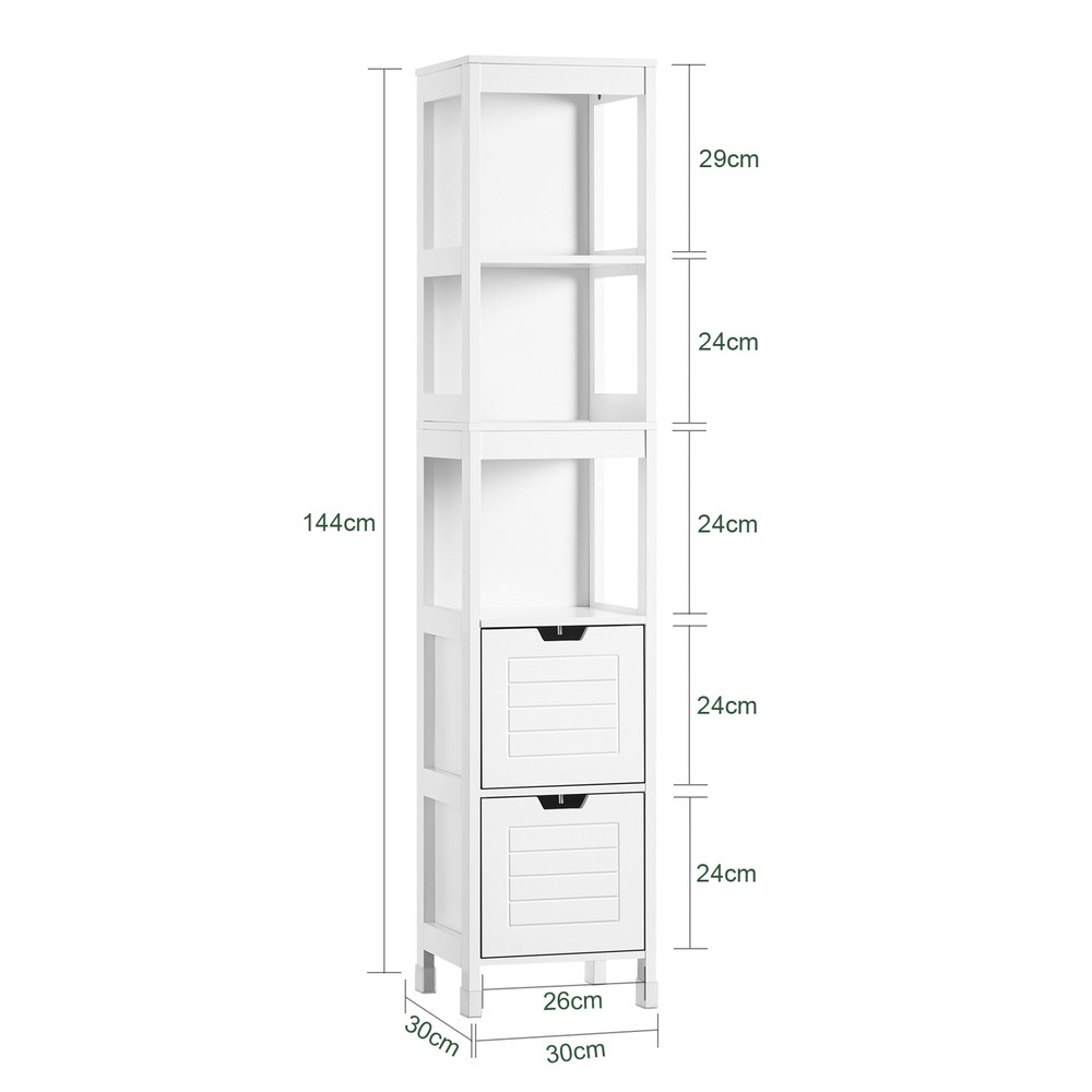 Kahden vetolaatikon ja kolmen hyllytilan ansiosta saat järjestettyä kaikki kylpyhuonetarvikkeesi siististi. Sen kompaktit mitat (30x30x145 cm) sopivat erinomaisesti myös pienempiin tiloihin, mutta kestää silti jopa 55 kg kuormaa laadukkaan MDF-rakenteensa ansiosta.