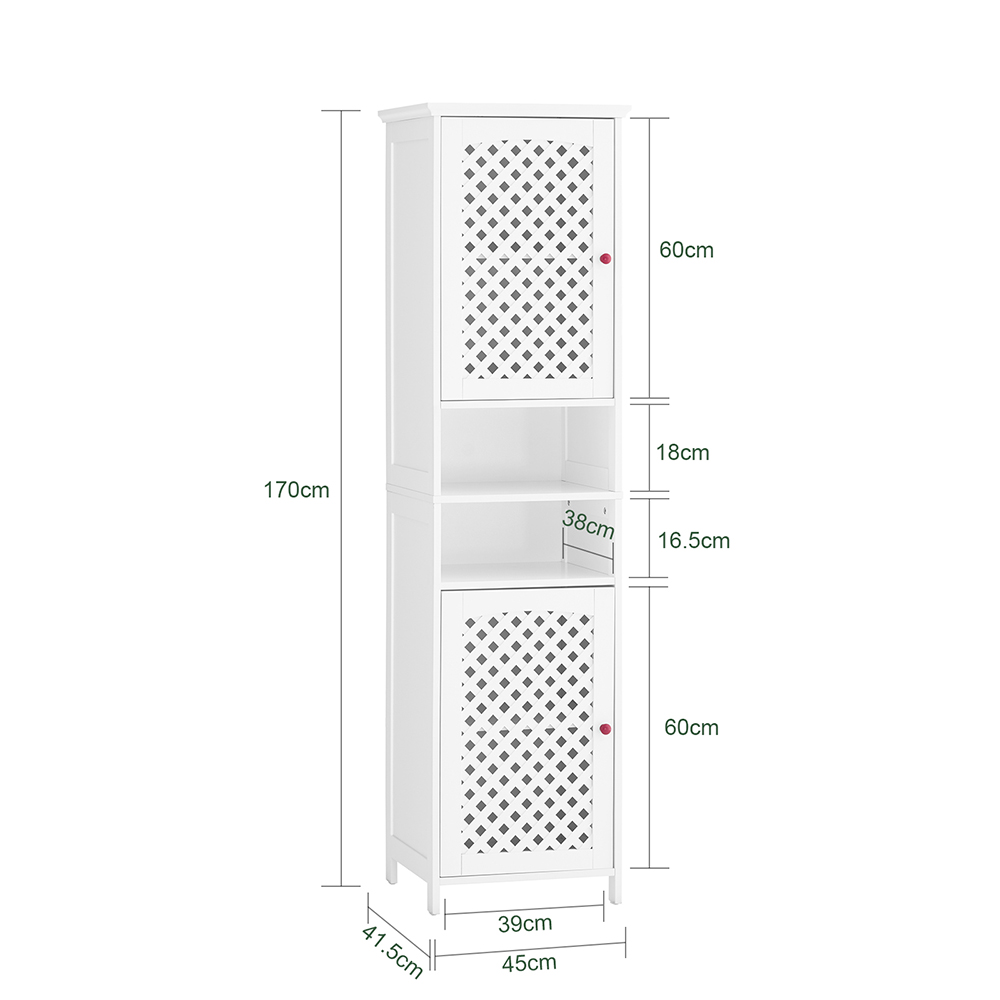 170 cm korkea kylpyhuonekaappi tarjoaa runsaasti tilaa pyyhkeille ja hygieniatuotteille. Kaapissa on 2 ovea sekä avohyllyt kätevää järjestelyä varten. Erinomainen ratkaisu perheille, jotka tarvitsevat lisää säilytystilaa.