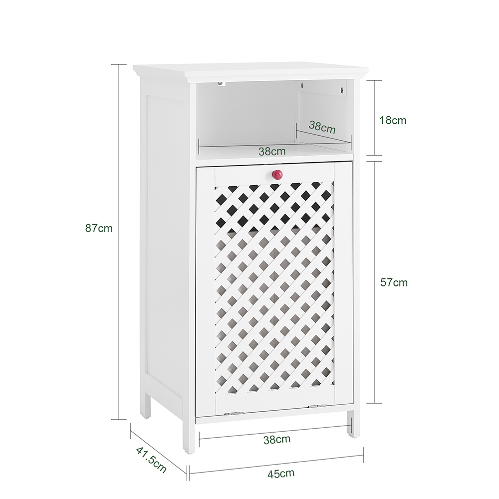 Tämä tilaa säästävä kylpyhuonekaappi (45×41,5×87 cm) yhdistää kestävän kankaisen pyykkikorin ja avohyllyn. Se soveltuu pyyhkeille, siivousvälineille tai likaiselle pyykille.
