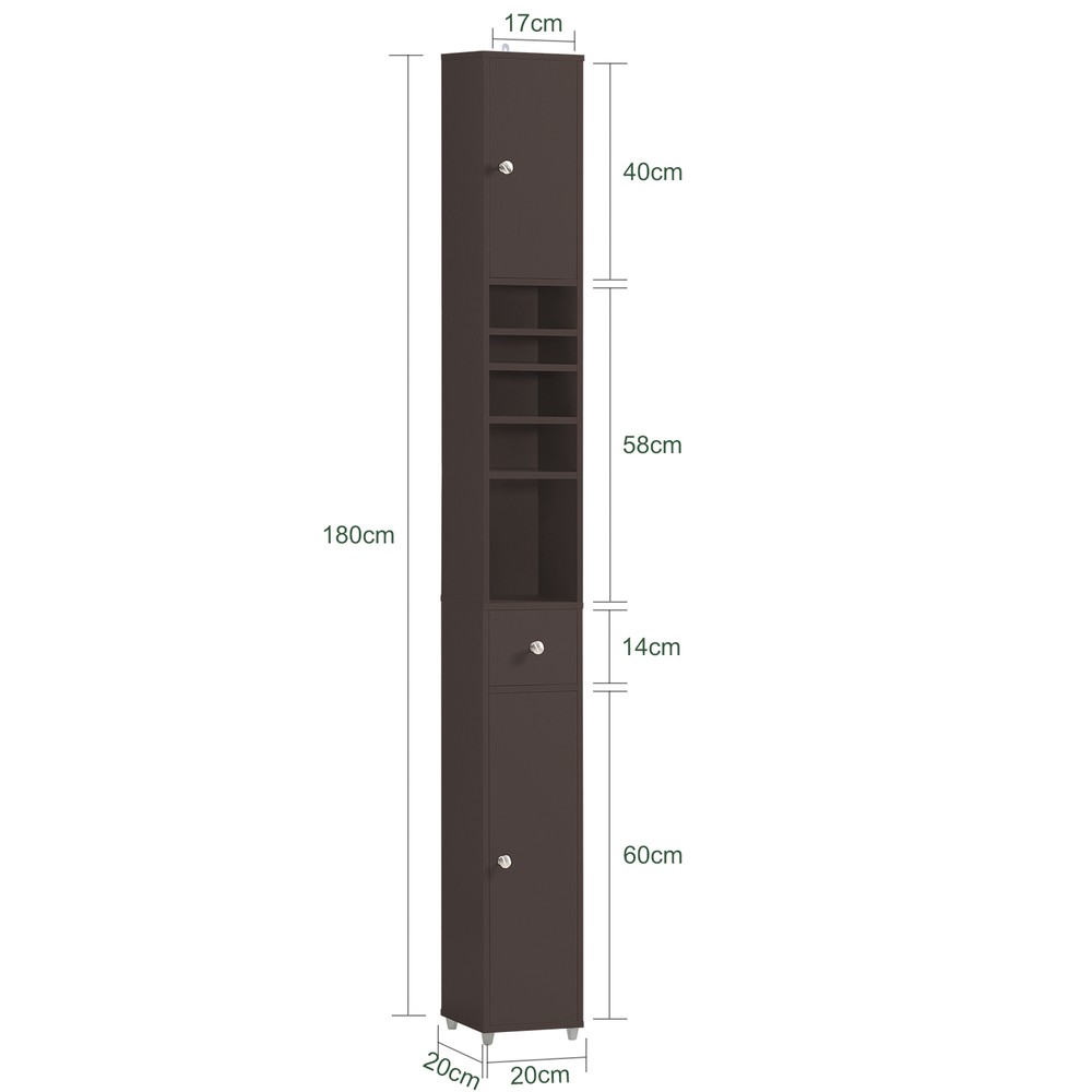 Tämä SoBuy-kaappi on täydellinen ratkaisu hyödyntämään käyttämättömiä tiloja kylpyhuoneessasi tai keittiössä. Vain 20 cm syvyydellään se mahtuu helposti kahden huonekalun väliin tai seinän viereen. Korkea ja siro design tarjoaa runsaasti säilytystilaa pitäen samalla kylpyhuoneesi siistinä ja tunnelmallisena.