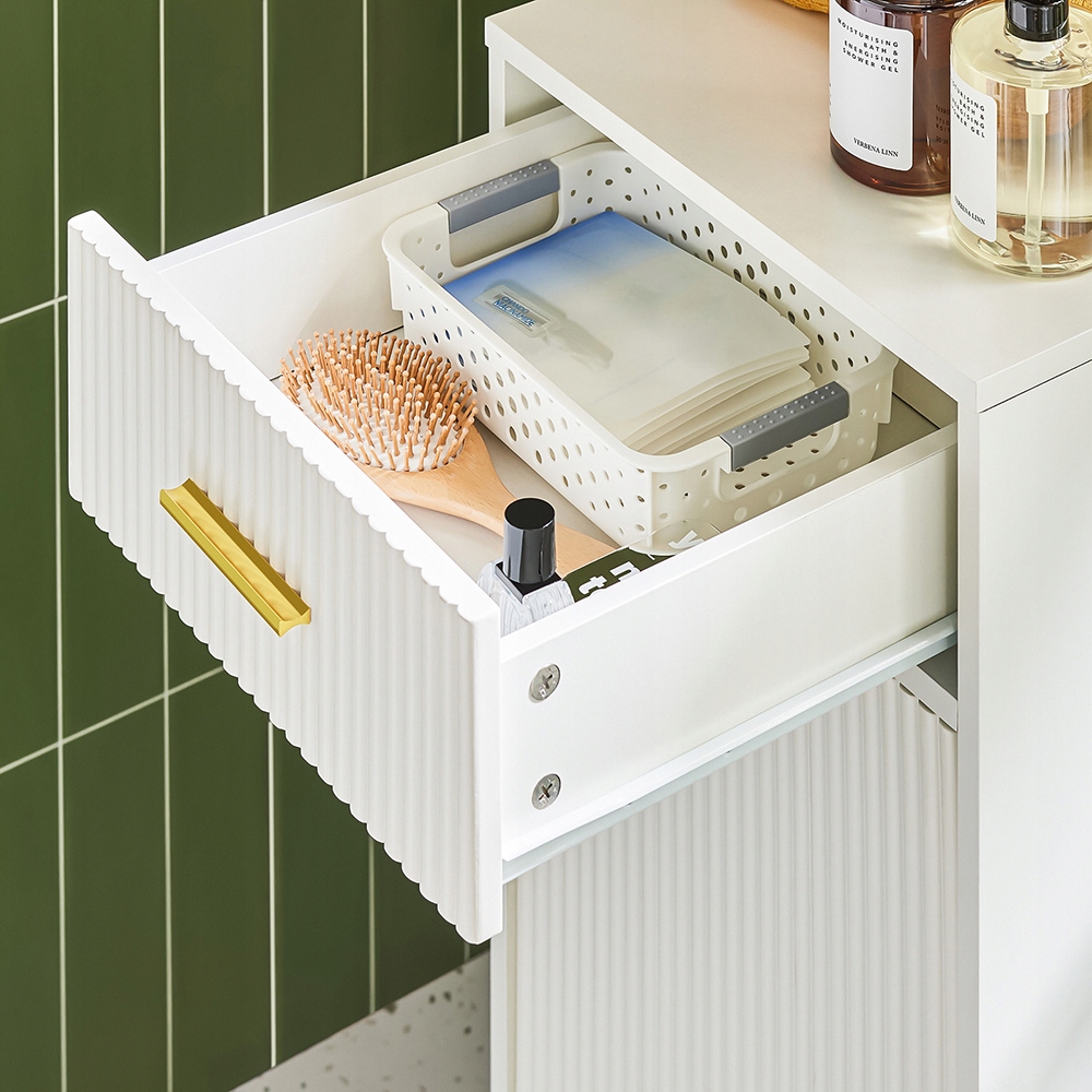 Ylälaatikot tarjoavat runsaasti säilytystilaa pienille kylpyhuonevarusteille. Integroitu pyykkikori helpottaa likaisten vaatteiden säilyttämistä.