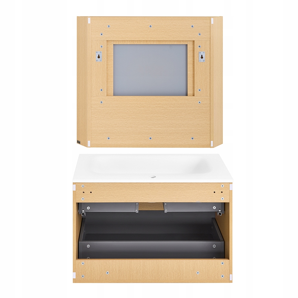 Kaappi tarjoaa runsaasti tilaa päivittäisille hygieniatarvikkeille: alla sijaitseva suljettu säilytystila, 2 tilavaa laatikkkoa sekä peilin yläpuolella oleva kätevä hylly pienten tavaroiden säilytykseen. 4 anti-naarmuuntumista huopatyynyä suojaa seiniä.