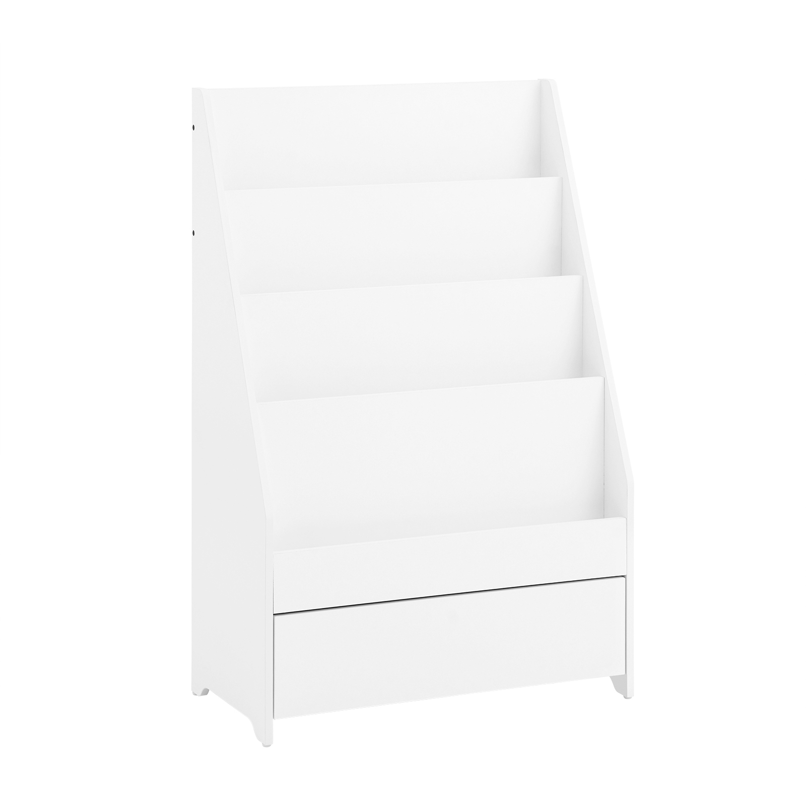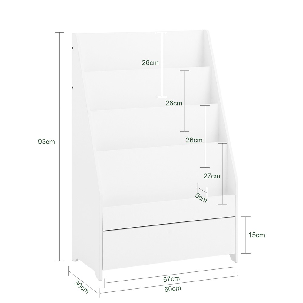 93 cm korkea nelitasoinen hylly mahdollistaa kirjojen näkyvän säilytyksen, mikä innostaa lukuharrastukseen. Alalaatikot tarjoavat lisätilaa leluille ja pienille esineille. Pyöristetyt kulmat ja vahva MDF-rakenne (E1-luokan ympäristöystävälliset materiaalit) takaavat turvallisuuden ja kestävyyden.