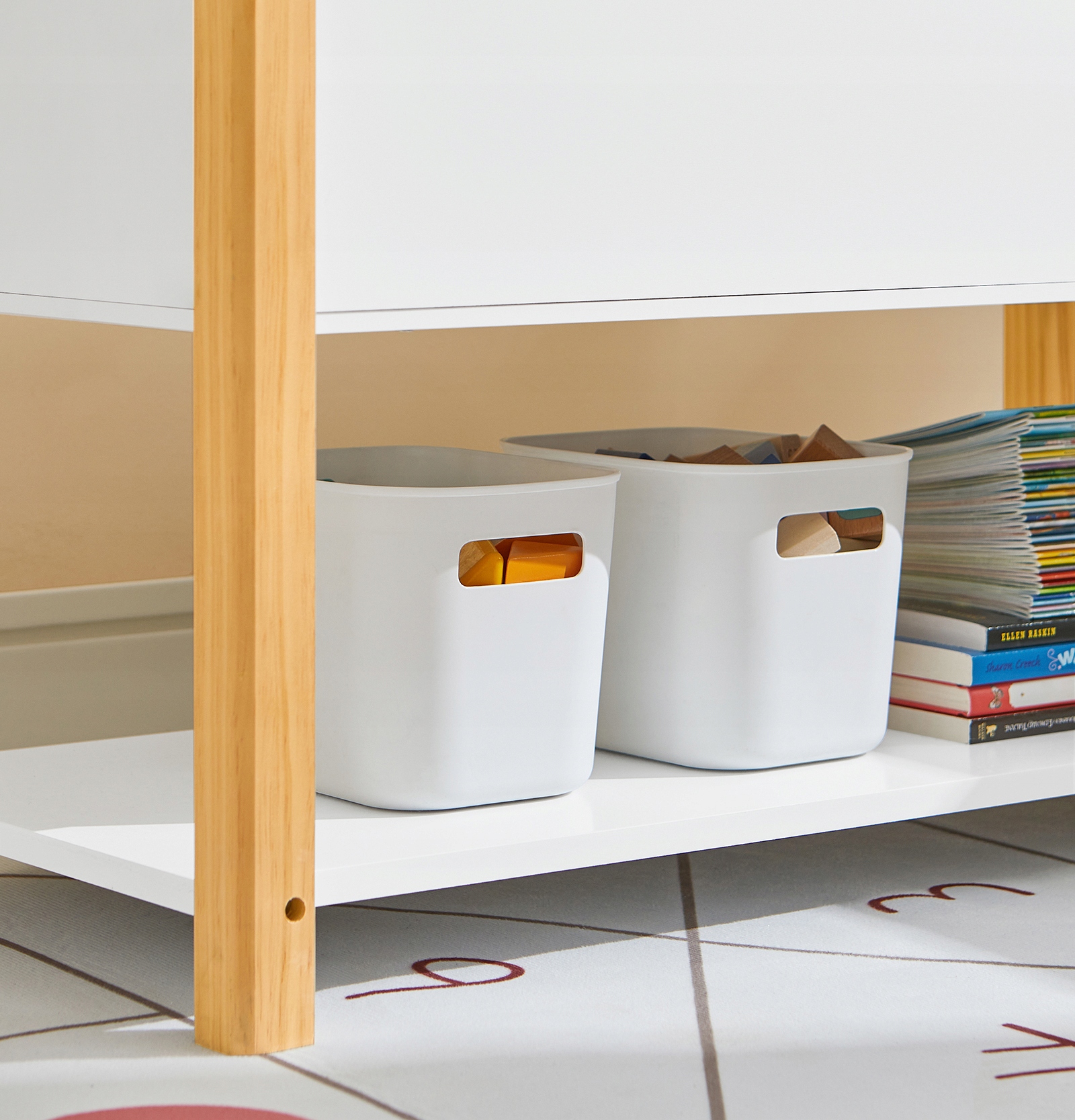 Tämä matala säilytyslaatikko tarjoaa runsaasti tilaa myös isoille leluille, kuten pehmoleluille ja palloille. Laadukas MDF-materiaali (E1-luokka) on kevyt, mutta kestävä, ja sen kantokyky on jopa 40 kg. Huolellisesti suunniteltu 45 cm korkeus mahdollistaa kirjojen helpon järjestelyn ilman aikuisten apua.