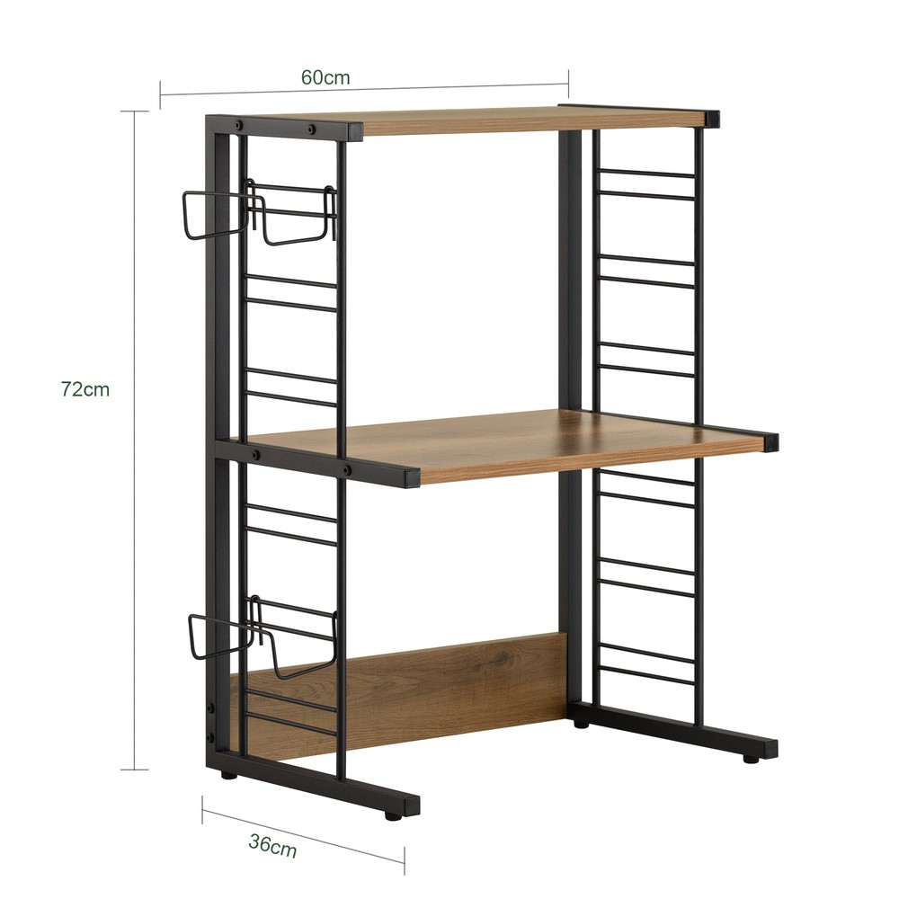 SoBuy:n keittiötasoja on suunniteltu monikäyttöiseksi – se toimii täydellisenä säilytysratkaisuna mikroaaltouunin tueksi, pullotelineenä tai käytännöllisenä keittiökalusteena. Sen ainutlaatuinen teollinen muotoilu yhdistää vintage-tyylistä puukuviointia ja mustaa metallikehystä, luoden retrohenkisen sävyn joka sopii kaikkiin kotityyleihin.
