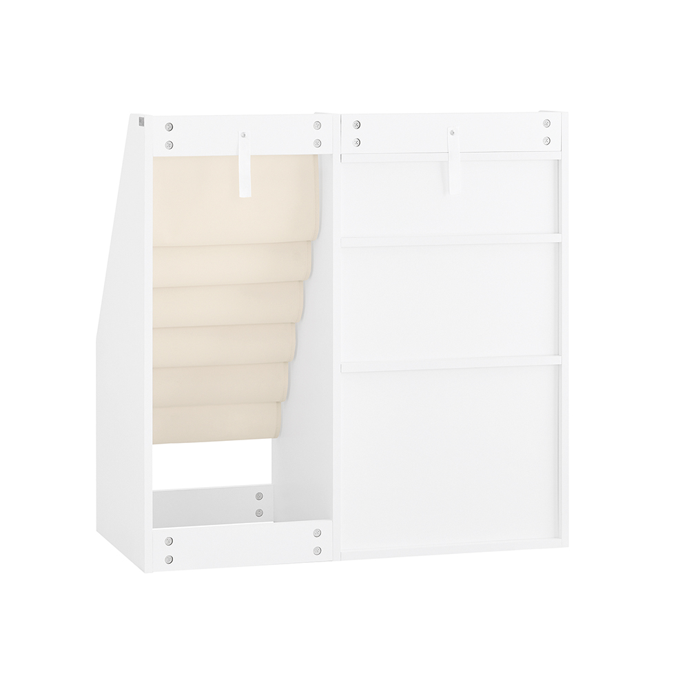SoBuy kangaskori tarjoaa käytännöllisen ratkaisun lasten tavaroiden säilytykseen. Yläosassa on kalteva hylly kirjoille, jossa on taskut pienempien kirjojen järjestelyyn. Alalokero soveltuu täydellisesti lelujen ja asusteiden säilytykseen.