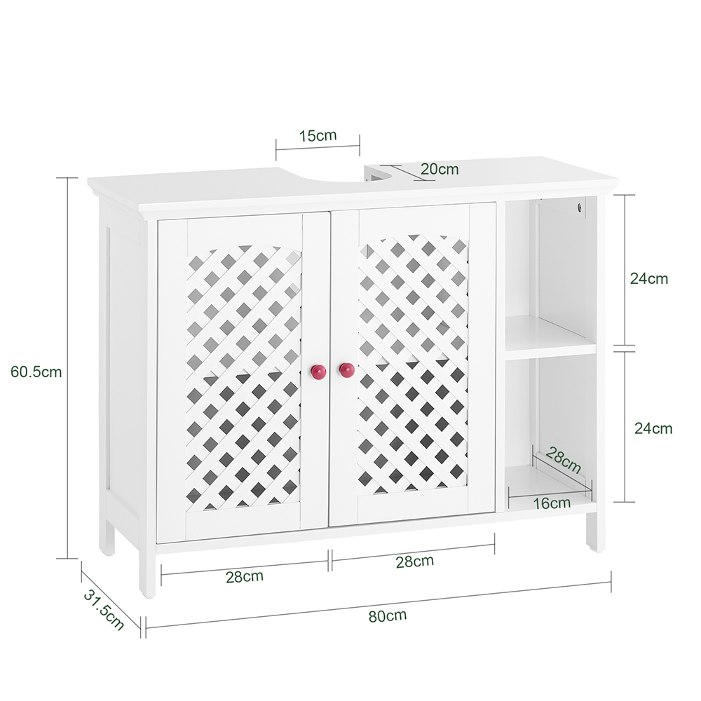 80×31,5×60,5 cm kokoinen tiskinalainen tarjoaa runsaasti tilaa pyyhkeille ja kylpyhuonetarvikkeille. Kaapissa on kaksi ovea ja avoin hylly, mikä mahdollistaa siistin järjestelyn. Erinomainen perheille, jotka tarvitsevat käytännöllistä säilytystilaa.
