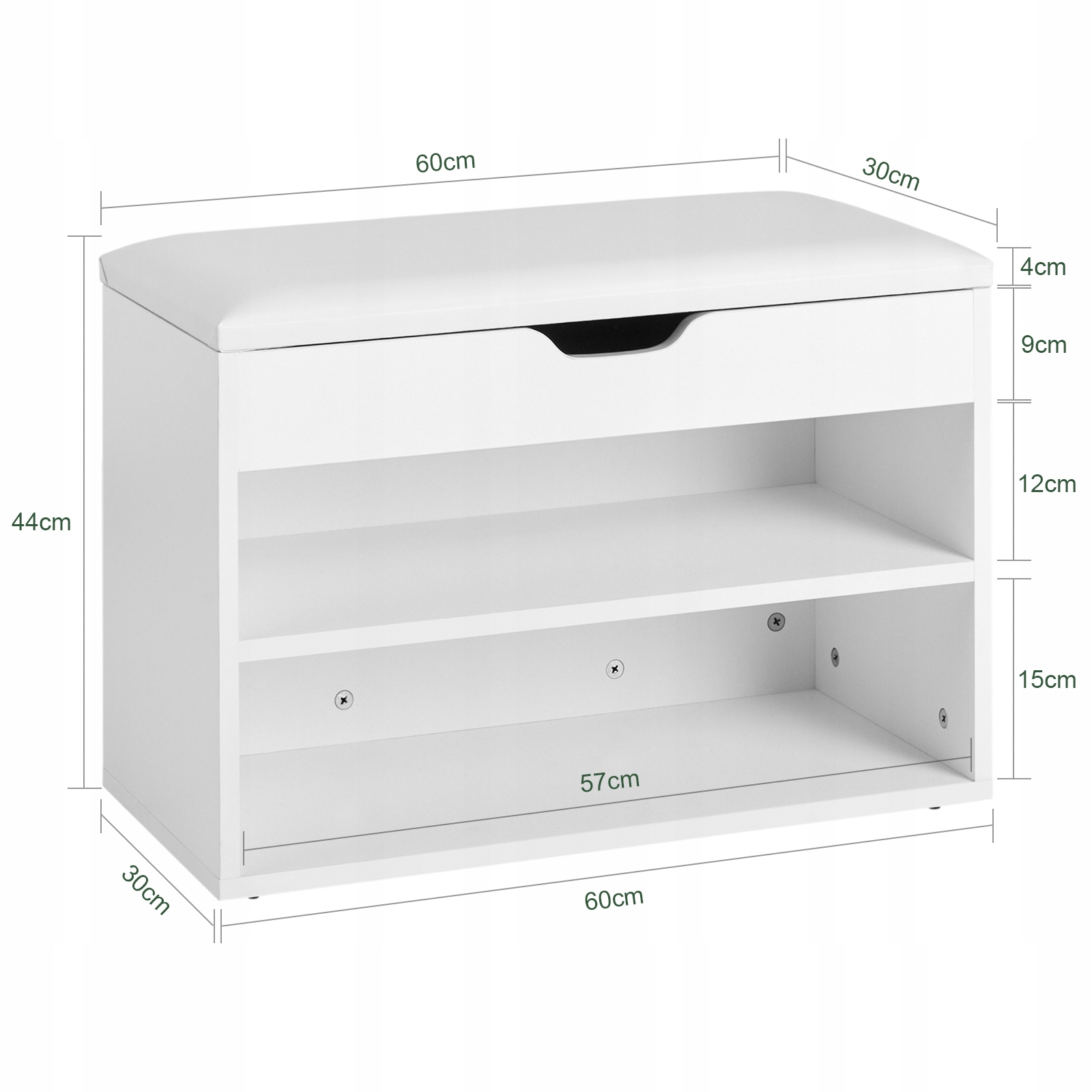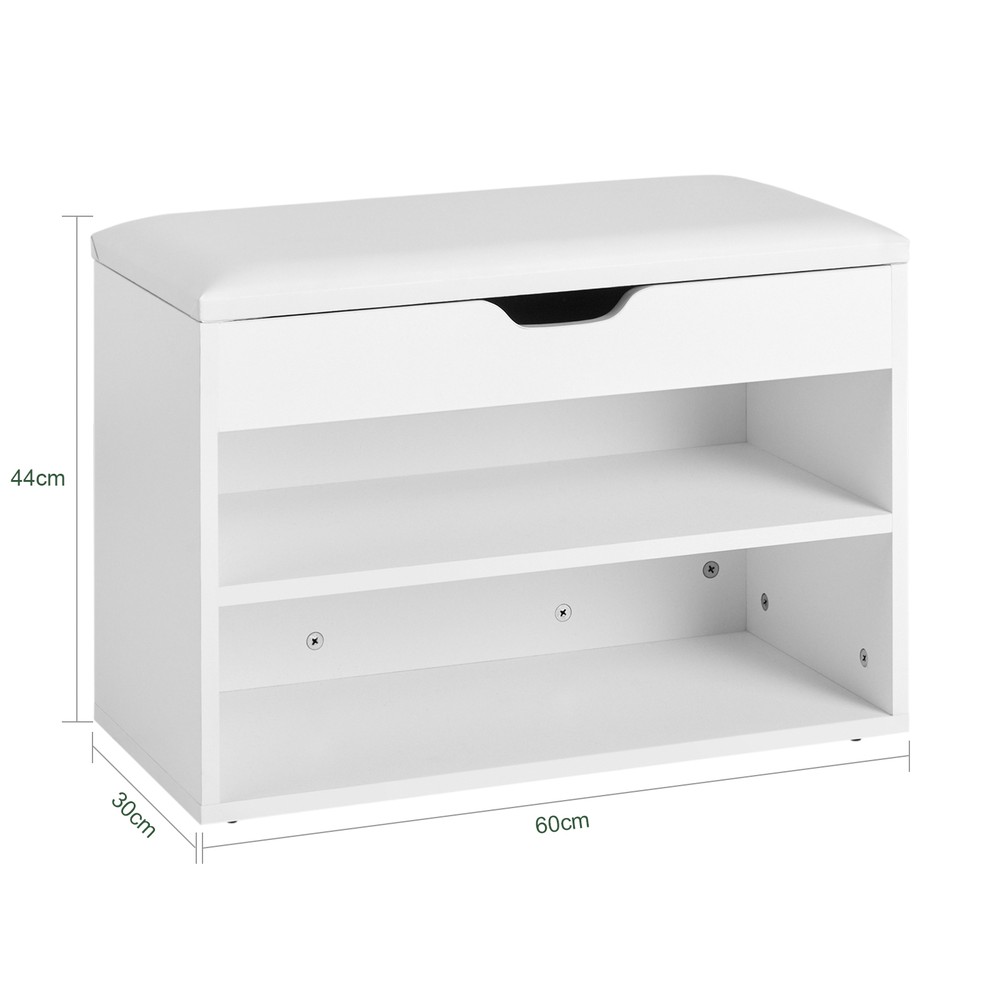 SoBuy FSR25-W kenkäpenkki on tyylikäs ja käytännöllinen ratkaisu kengän säilytykseen. Pehmustettu istuin tekee jalkineiden vaihdosta miellyttävää, ja tilava säilytystila istuimen alla pitää kengät siististi järjestyksessä. Mitat 60x30x44 cm, joten se sopii täydellisesti eteiseen, parvekeelle tai mihin tahansa kotisi tilaan.