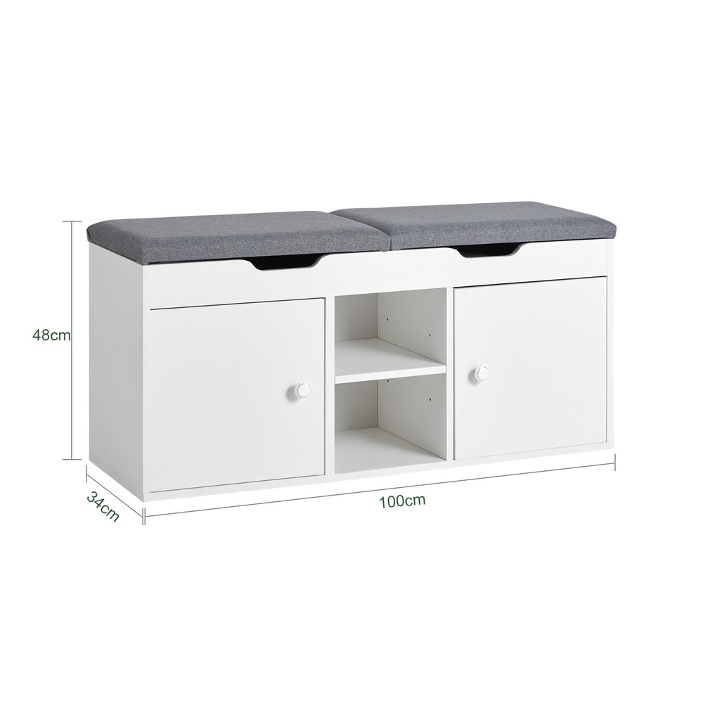 SoBuy säilytyspenkki yhdistää käytännöllisyyden tyylikkääseen pohjoismaiseen muotoiluun. Tämä monikäyttöinen huonekalu toimii sekä siistinä kenkävarastona että mukavana istuimena, jossa on pehmustettu istuinosa. Sen tilava säilytystila mahdollistaa jopa 150 kg kuorman, ja se on valmistettu kestävästi lastulevystä sekä ympäristöystävällisestä muovikalvosta.