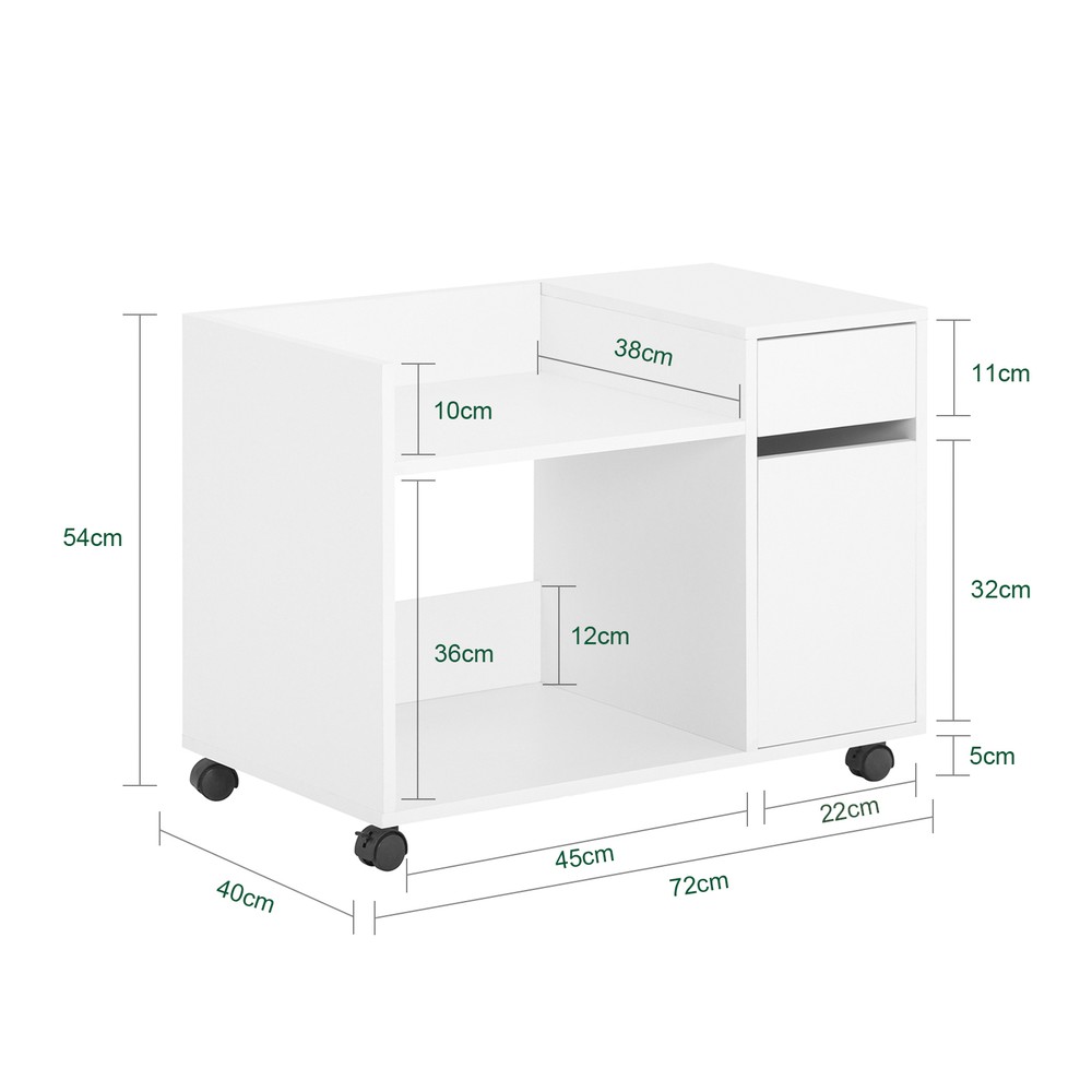 Kaapissa on 2 avointa lokeroa (ylälokero 38x45x10 cm on suunniteltu erityisesti tulostimille), 1 laatikko sekä useita säilytyspaikkoja papereille, kirjoille ja toimistotarvikkeille. Kompakti mutta tilava rakenne (72x40x54 cm) sopii täydellisesti pienempiin tiloihin, ja sen 4 kääntyvää pyörää mahdollistavat helpon liikuttelun. Kahdessa pyörässä on turvalukot vakaalle paikallaan pysymiselle.