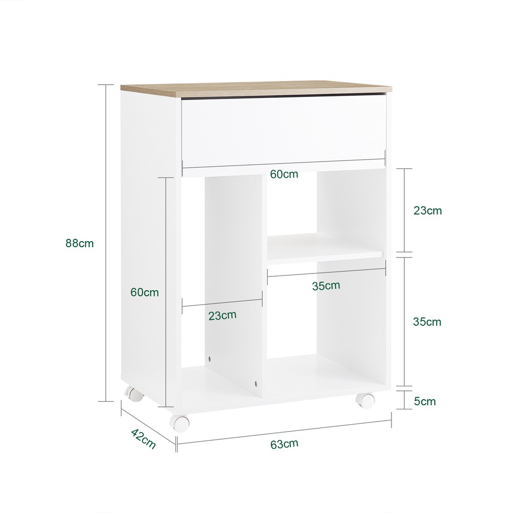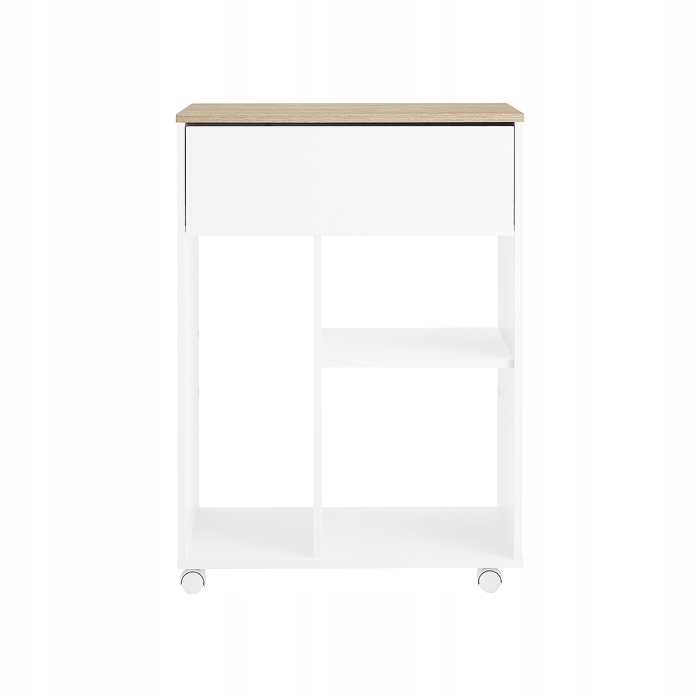 Tilava ylälaatikko (60 cm leveä) tarjoaa kätevän säilytystilan asiakirjoille tai pienille esineille. Kaksi avointa alahyllyä mahdollistaa monipuolisen käytön kirjoille, koristeille tai toimistotarvikkeille. 63x42 cm kokoinen pinta soveltuu täydellisesti tulostimelle tai muulle toimistolaitteistolle.