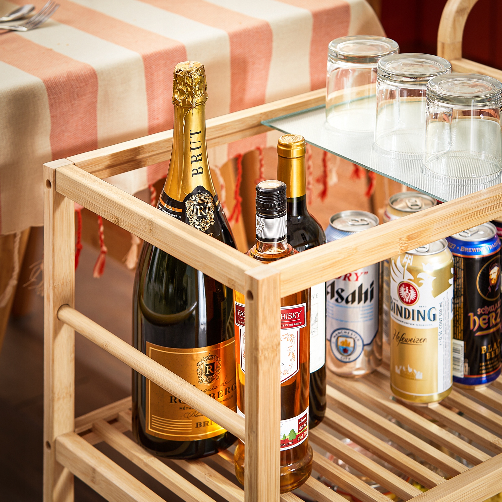 Tämä tarjoiluvaunu yhdistää käytännöllisyyden ja eleganssin täydentäen kodin sisustusta. Siinä on avohyllyt ja lasihylly keittiövälineille, astioille ja laseille. Pullot pysyvät järjestyksessä omassa säilytystilassaan.
