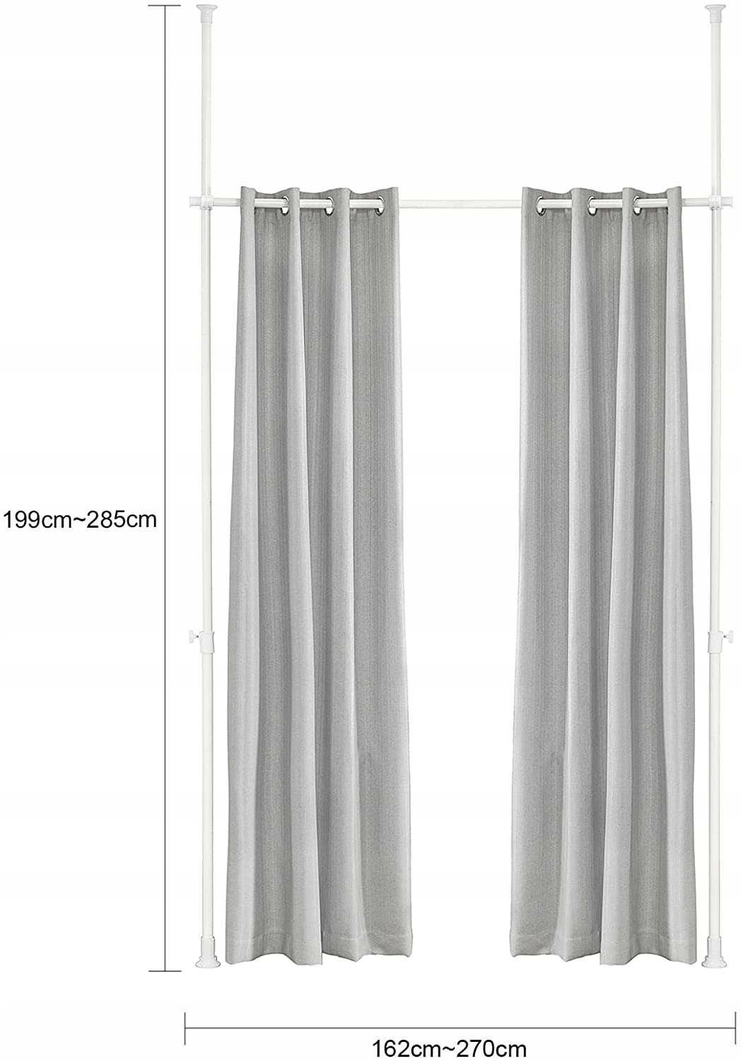 Tekniset tiedot: - Mitat: Leveys (162-270) x korkeus (199-285) cm - Verhon pituus: 224 cm - Paino: 3,3 kg - Kantavuus: 10 kg - Pakkausmitat: 115 x 12 x 10 cm