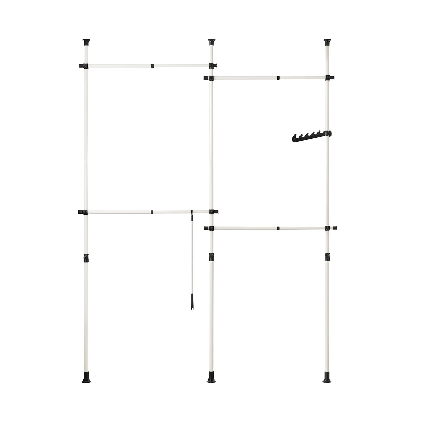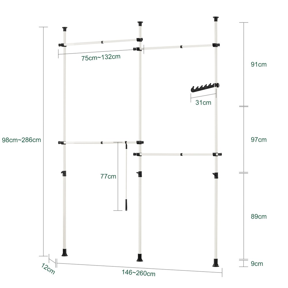 SoBuy-teleskooppivarastointijärjestelmä tuo tyylikkään ja käytännöllisen ratkaisun vaatteidesi säilytykseen. Pohjoismaisin designiin perustuva järjestelmä asennetaan helposti ilman työkaluja lattian ja katon väliin, säästäen arvokasta tilaa pienemmissäkin asunnoissa.