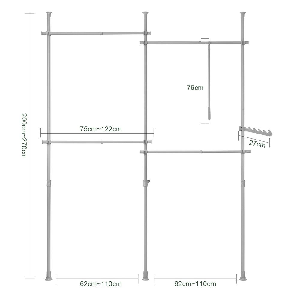 <p>Järjestelmän teleskooppirakenteen ansiosta voit säätää sen täydellisesti tilan mukaan (200-270 cm korkeus). 4 säädettävää vaatetelinettä tarjoavat joustavan ripustustilan paidoille, takille ja asusteille. Yksi telinettä voidaan taitella kokonaan pois tieltä, kun sitä ei tarvita.</p>
