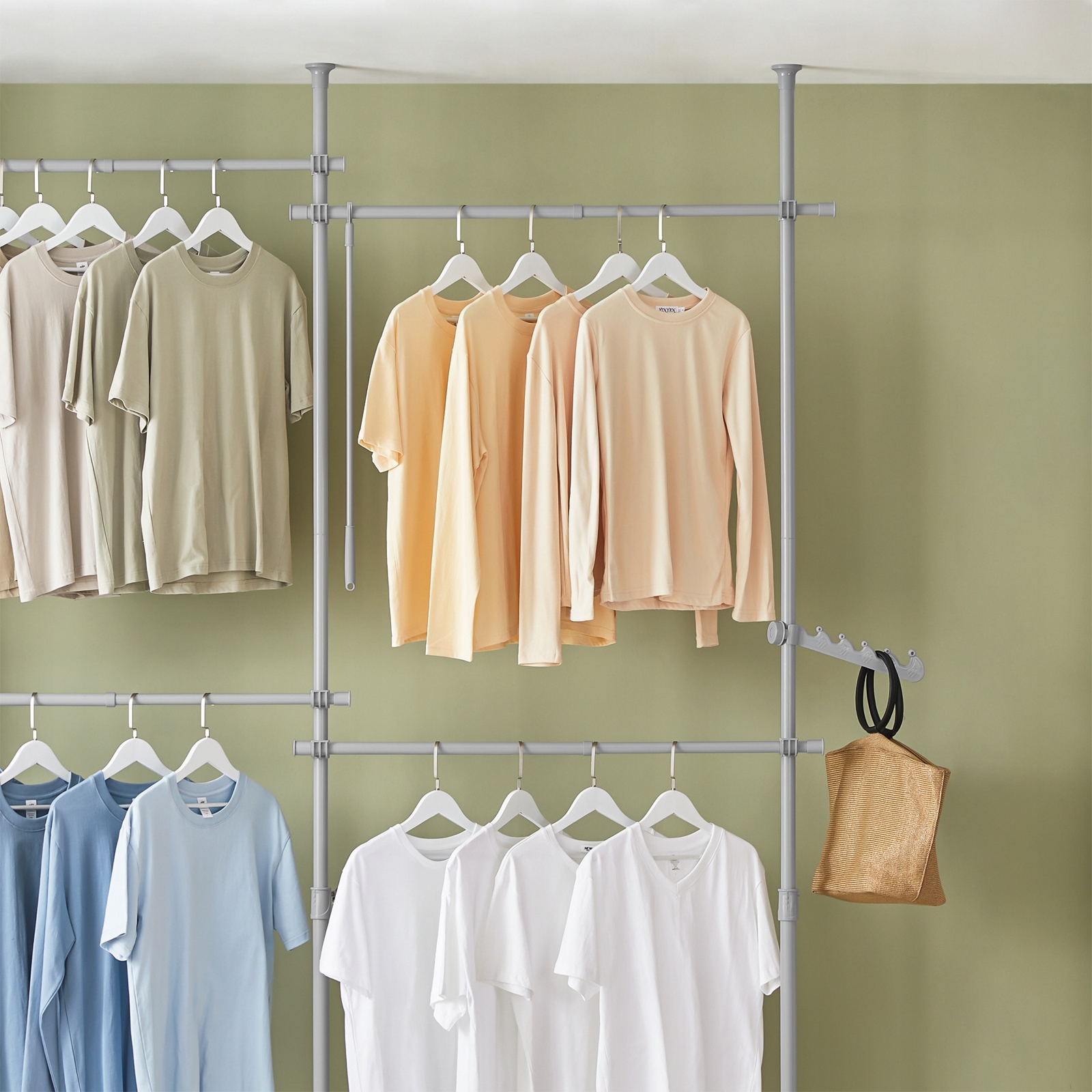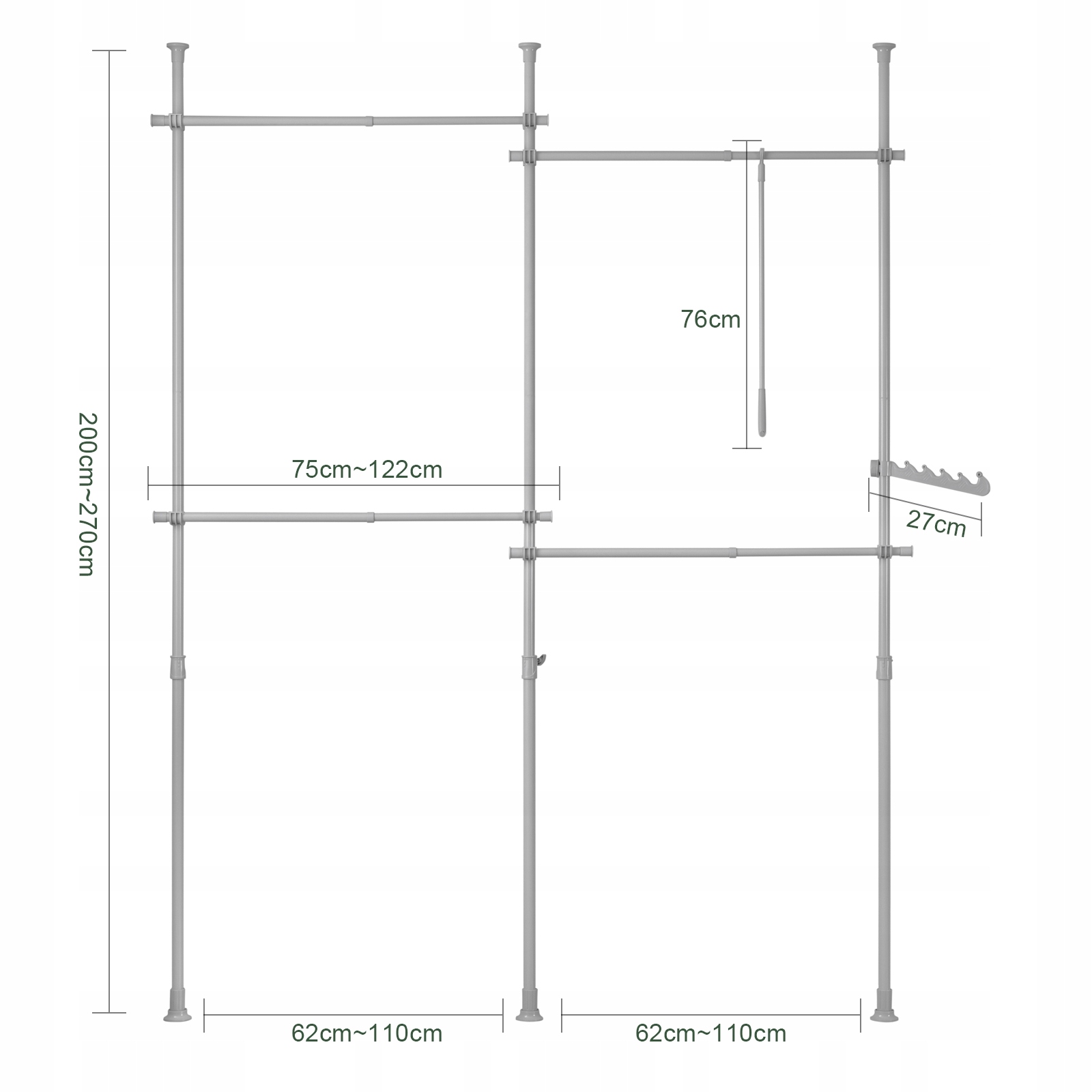 Järjestelmän teleskooppirakenteen ansiosta voit säätää sen täydellisesti tilan mukaan (200-270 cm korkeus). 4 säädettävää vaatetelinettä tarjoavat joustavan ripustustilan paidoille, takille ja asusteille. Yksi telinettä voidaan taitella kokonaan pois tieltä, kun sitä ei tarvita.