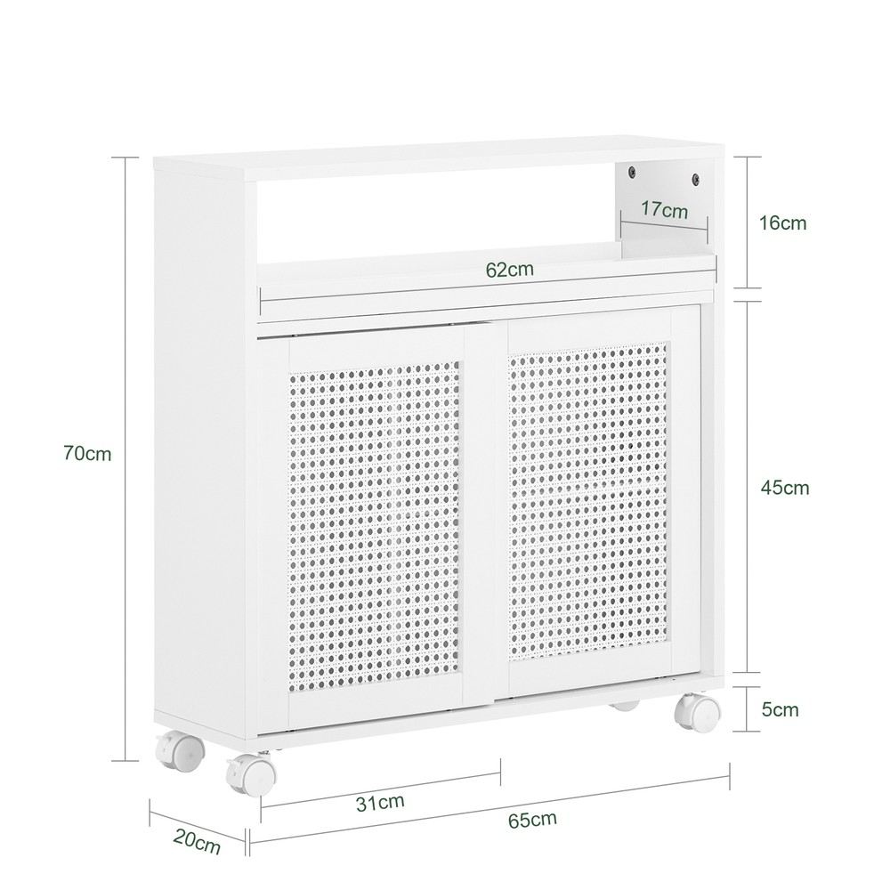 Hyllyllä on kolme säädettävää korkeustasoa, ja sen 20 cm leveys mahdollistaa joustavan sijoittamisen mihin tahansa tilaan – olipa kyseessä sitten kylpyhuone, keittiö tai olohuone. 4 pyörivää pyörää tekevät siitä helposti liikuteltavan.
